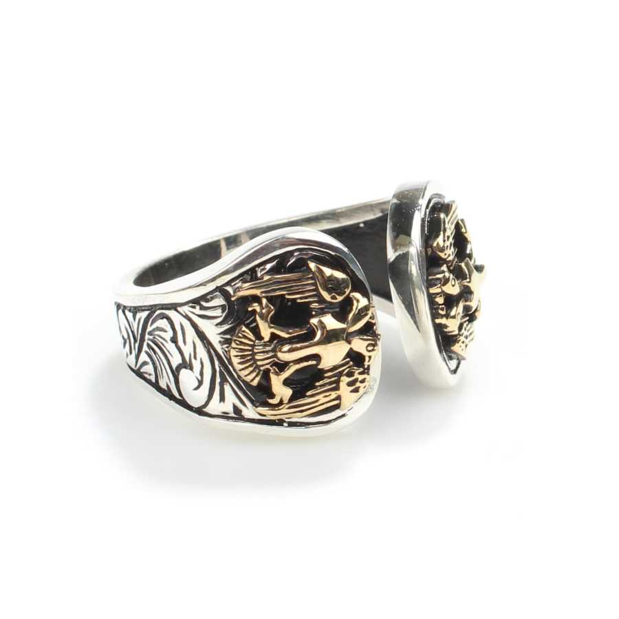 925 ayar gümüş erkek yüzüğün önü açıktır. Ölçüsü ayarlanabilir. Gümüş yüzüğün kollarında işlemeler vardır. yüzüğün üst tarafında ise çift başlı kartal vardır. Yüzük ölçüsü: 21 no Gramı: 13,16 gr
