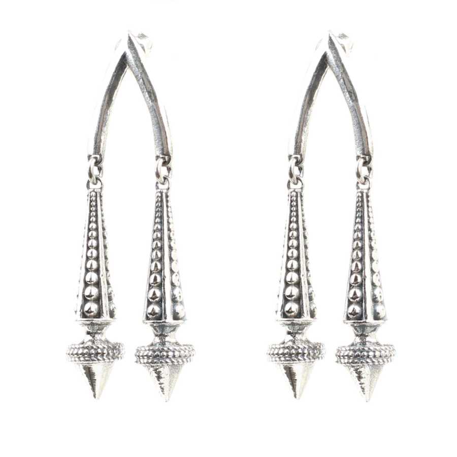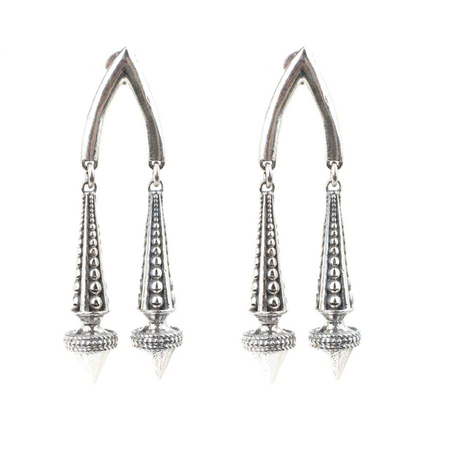 Gümüş küpe 925 ayar gümüşten yapılmıştır. Antik Bizans döneminden esinlenilen çift koni şeklindeki küpe 1,3 cm'ye 4,7 cm boyutlarındadır. Küpe taşsızdır. Ağırlığı 14,22 gramdır.