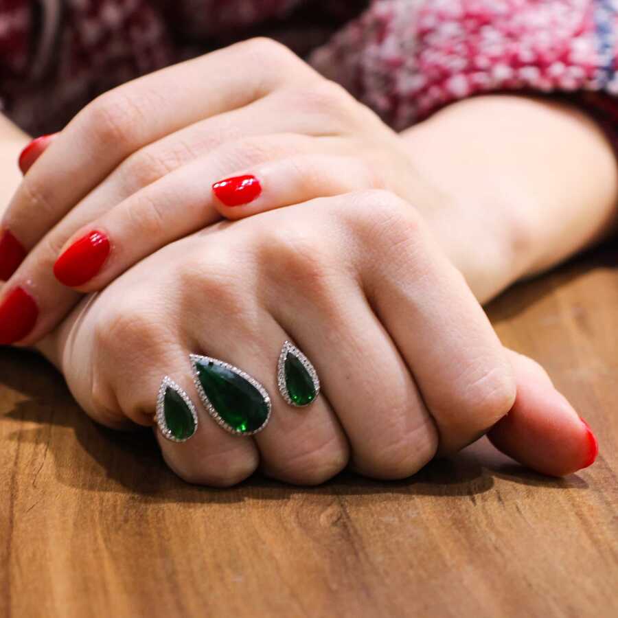Yüzük 925 ayar gümüşten üretilmiştir. Çift parmak şeklindeki yüzük 14 - 9 ölçüdür. Tüm ölçüler yapılabilmektedir. Yüzük beyaz ve zümrüt renk zirkon taşlara sahiptir. Çift parmak yüzük 2,2 cm'ye 3,4 cm boyutlarındadır. Ağırlığı 9,02 gramdır.
