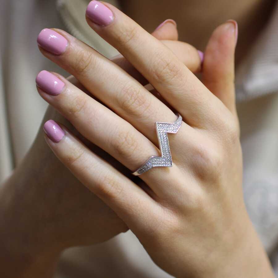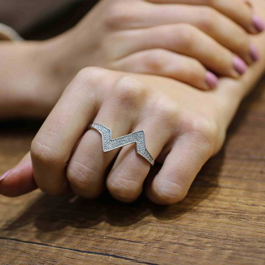 925 Ayar Gümüş Çift Parmak Zikzak Tasarım Beyaz Taşlı Yüzük