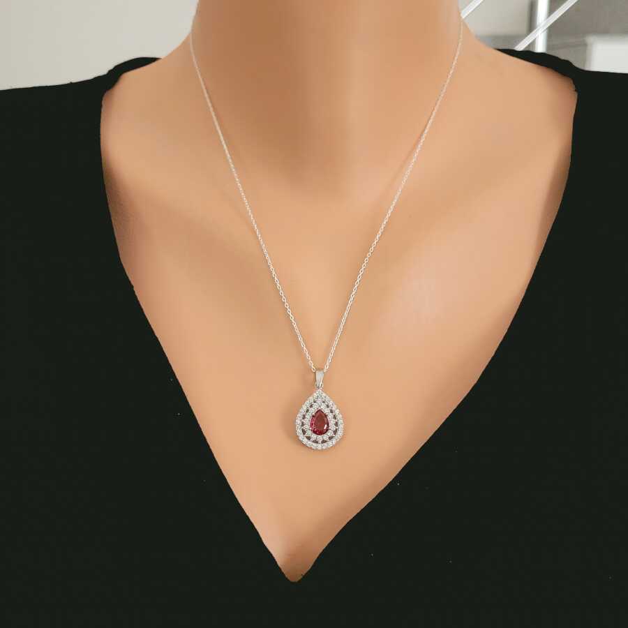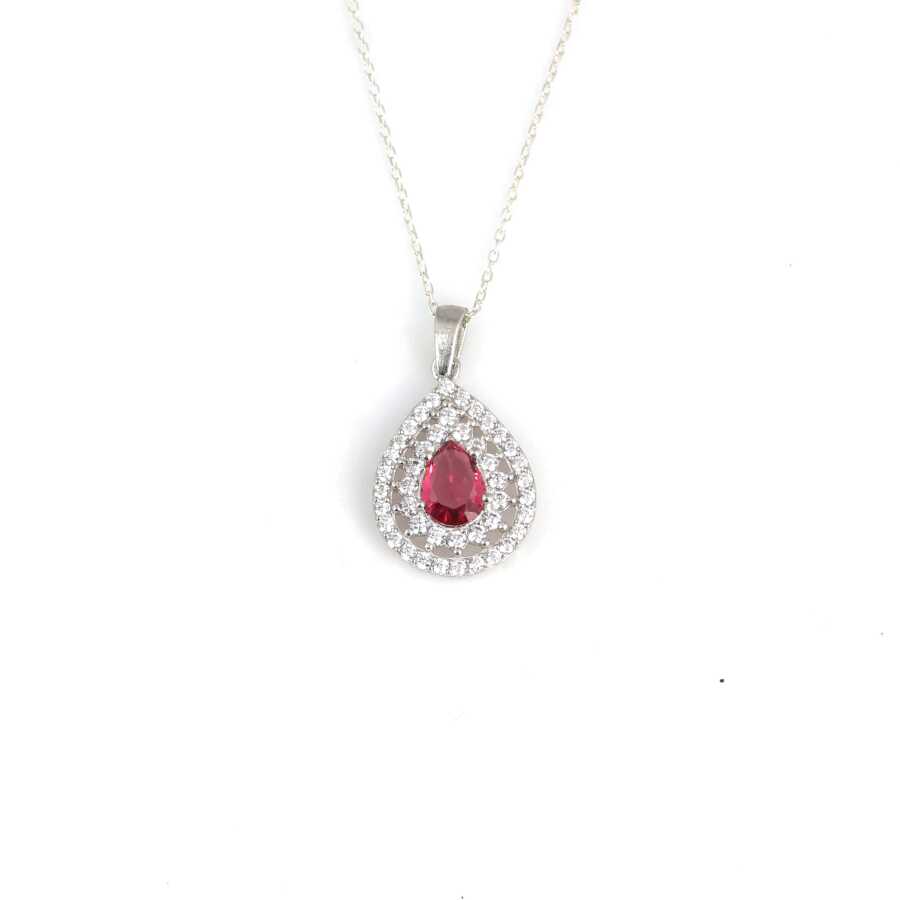 Notify me when its in stock Gümüş kolye 925 ayar gümüşten yapılmıştır. Damla çift sıra anturaj model kolye 1,8 cm'ye 1,5 cm boyutlarındadır. Yakut renk taşı 0,8 cm'ye 0,6 cm boyutlarındadır. Gümüş kolye 45 cm uzunluğundadır. Kolye beyaz ve yakut renk zirkon taşlıdır. Ağırlığı 3,59 gramdır.