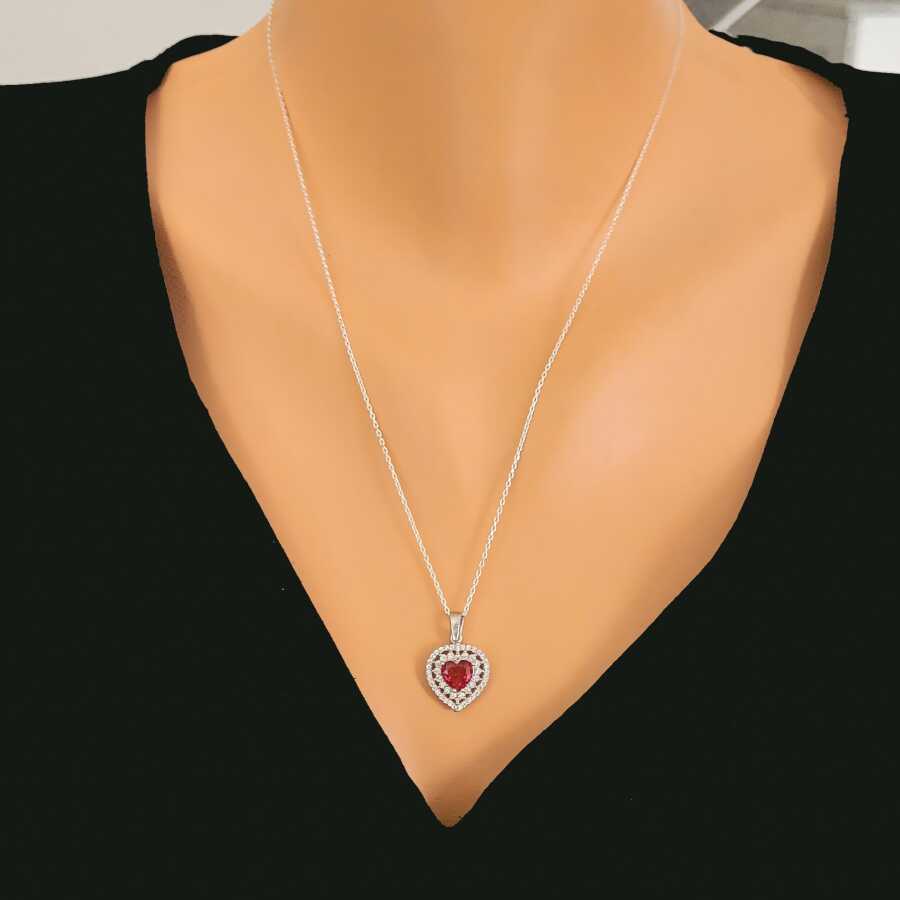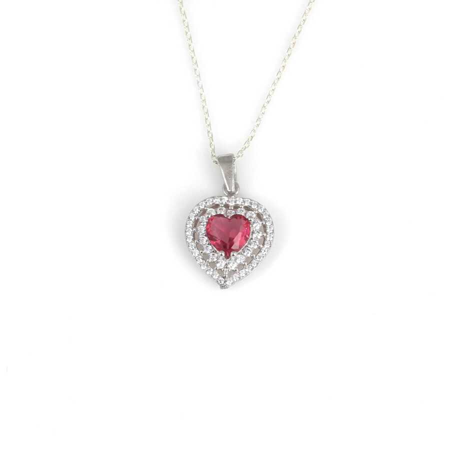 Notify me when its in stock Gümüş kolye 925 ayar gümüşten yapılmıştır. Kalp çift sıra anturaj model kolye 1,5 cm'ye 1,4 cm boyutlarındadır. Yakut renk taşı 0,7 cm boyutlarındadır. Gümüş kolye 45 cm uzunluğundadır. Kolye beyaz ve yakut renk zirkon taşlıdır. Ağırlığı 3,04 gramdır.