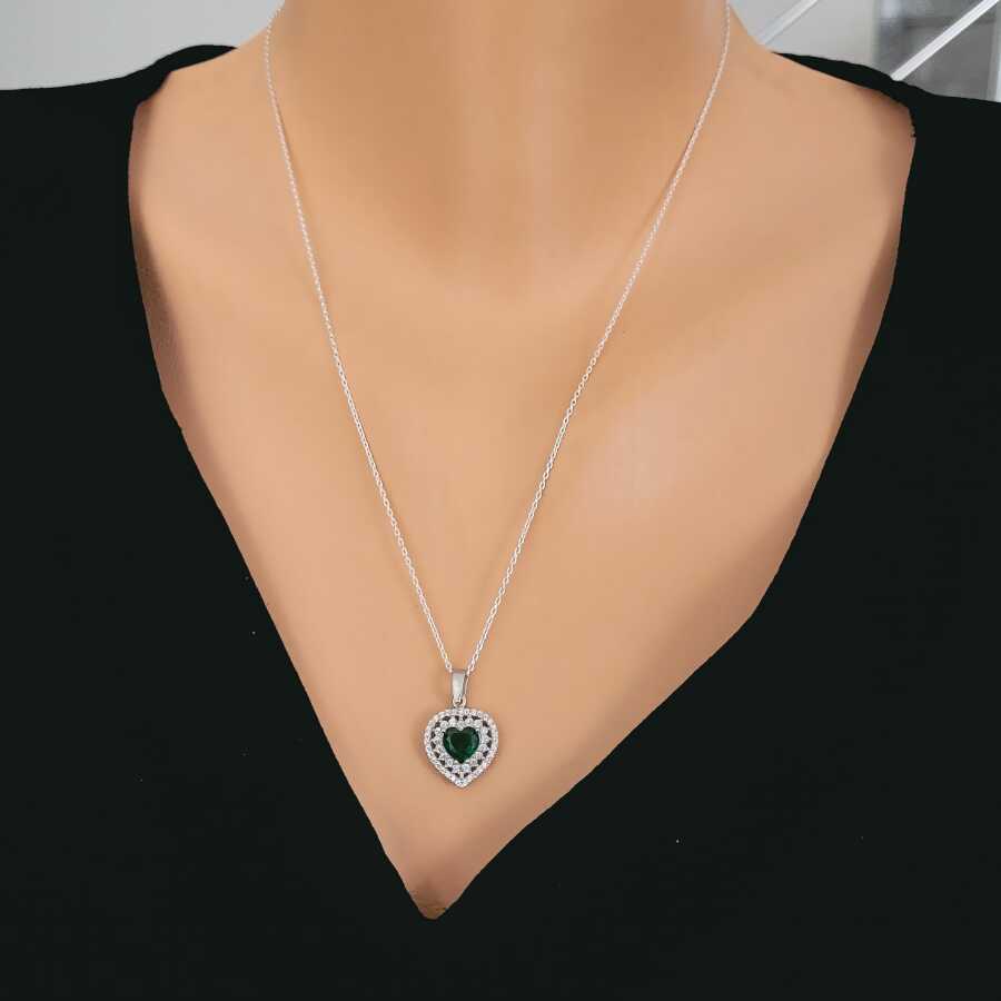 Notify me when its in stock Gümüş kolye 925 ayar gümüşten yapılmıştır. Kalp çift sıra anturaj model kolye 1,5 cm'ye 1,4 cm boyutlarındadır. Zümrüt renk taşı 0,7 cm boyutlarındadır. Gümüş kolye 45 cm uzunluğundadır. Kolye beyaz ve zümrüt renk zirkon taşlıdır. Ağırlığı 3,05 gramdır.
