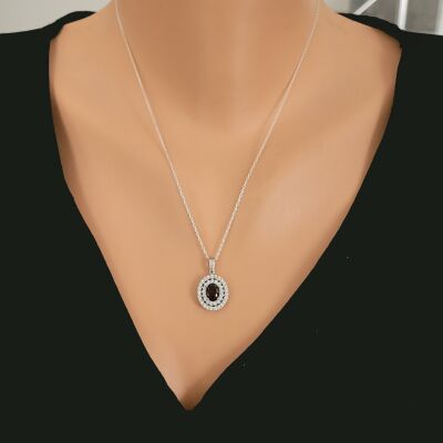 Gelince Haber Ver Gümüş kolye 925 ayar gümüşten yapılmıştır. Oval çift sıra anturaj model kolye 1,6 cm'ye 1,4 cm boyutlarındadır. Garnet taşı 0,8 cm'ye 0,6 cm boyutlarındadır. Gümüş kolye 45 cm uzunluğundadır. Kolye beyaz renk zirkon ve garnet taşlıdır. Ağırlığı 3,29 gramdır.