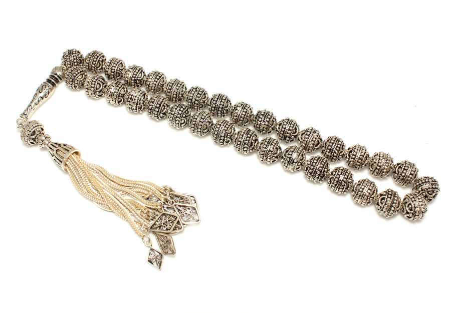 Küre kesim gümüş tesbih topu 1,0 cm boyutlarındadır. Gümüş tespih toplam uzunluğu 27 cm'dir. Tespihin ağırlığı 89,86 gramdır.