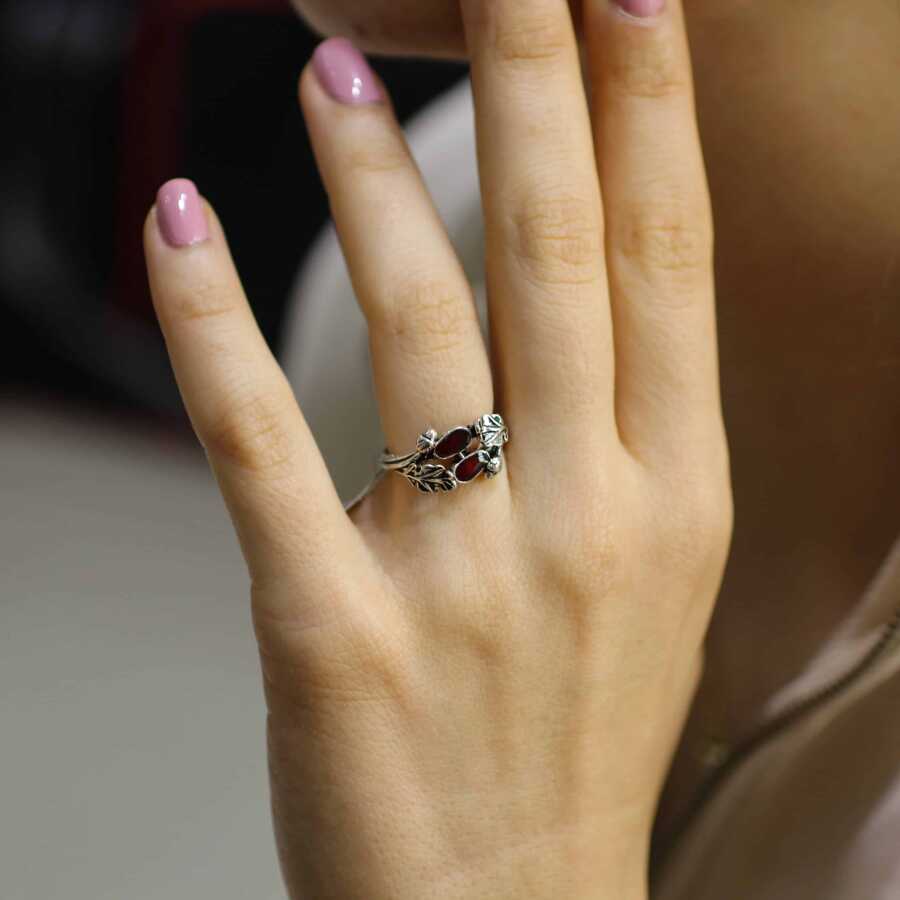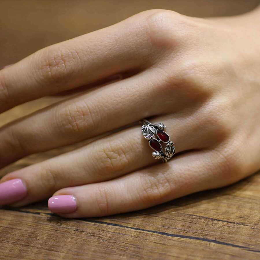 925 Ayar Gümüş Çift Yapraklı Kırmızı Mineli Yüzük