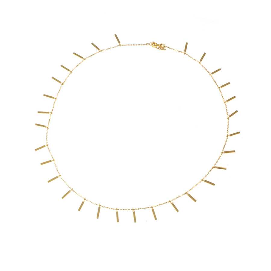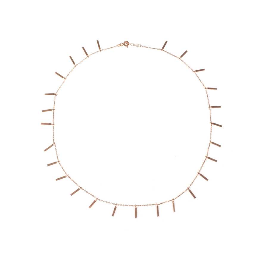 Gümüş kolye 925 ayar gümüşten yapılmıştır. Çubuk model ince gerdanlık kolye zinciri 43,5 cm uzunluğundadır. Kolye taşsızdır. Sallanan çubuklar 0,8 cm'ye 0,2 cm boyutlarındadır. Ağırlığı 5,07 gramdır.