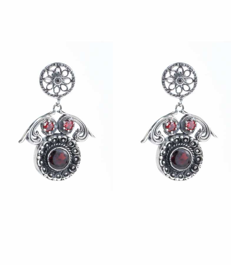 Gümüş küpe 925 ayar gümüşten yapılmıştır. Antik Bizans şeklindeki çiçekli küpe yakut renk zirkon taşlıdır. Ağırlığı 11,43 gramdır.