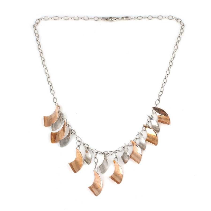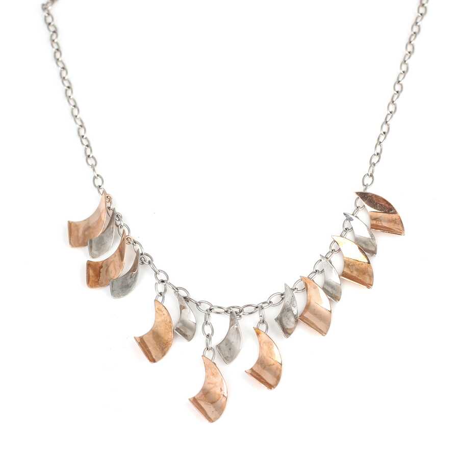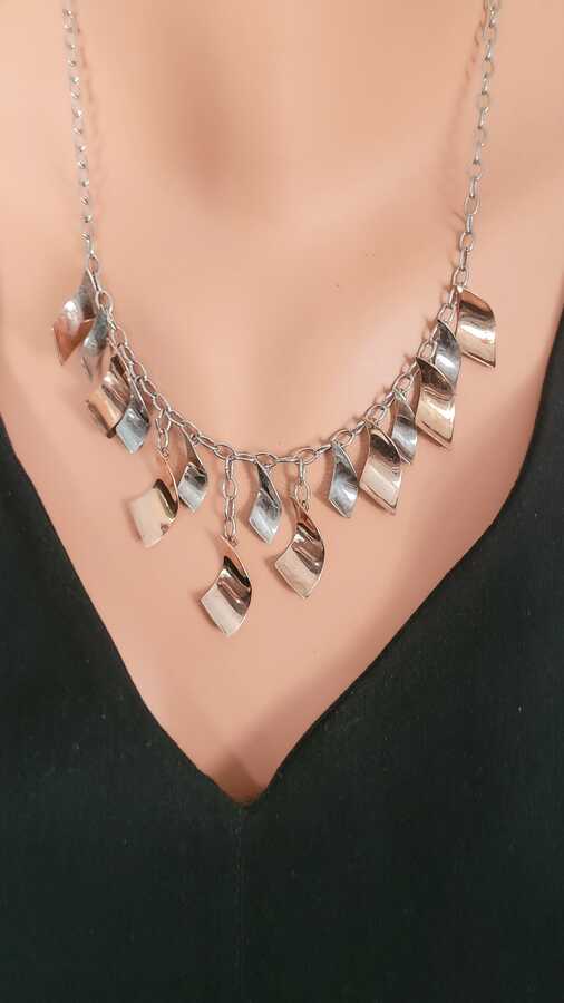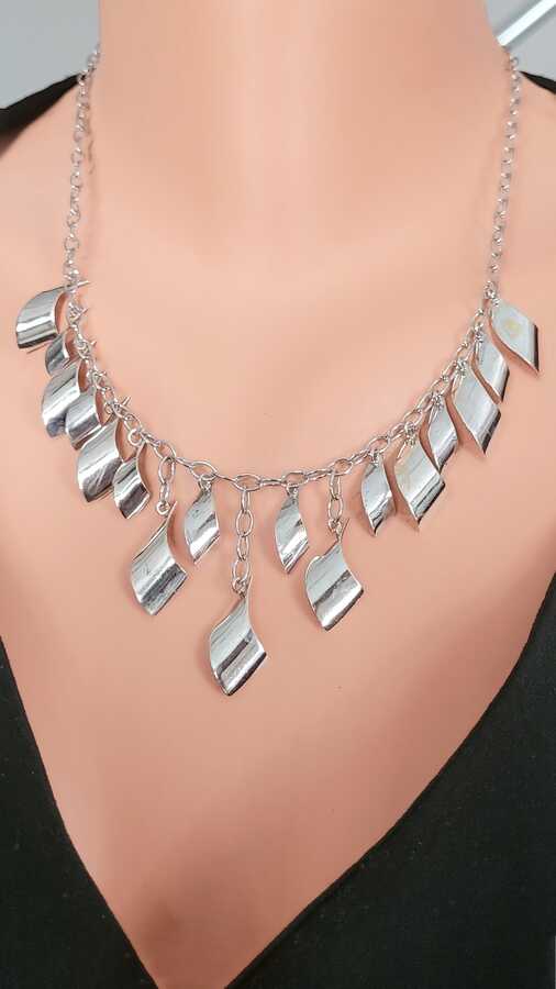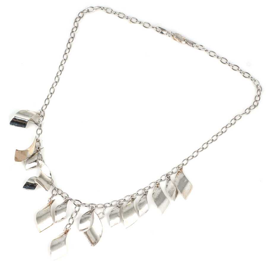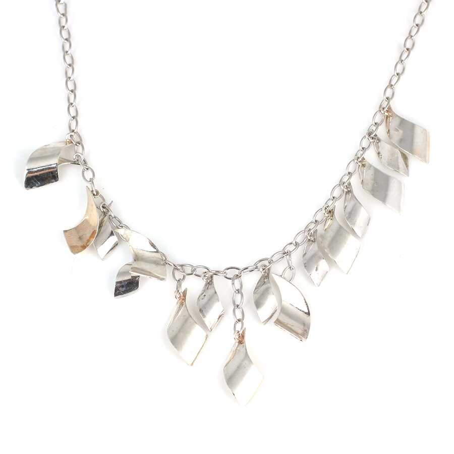 Gümüş kolye 925 ayar gümüşten yapılmıştır. Dalgalı parçalardan oluşan kolye - cm uzunluğundadır. Kolye taşsızdır. Ağırlığı 16,96 gramdır.