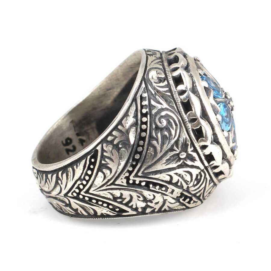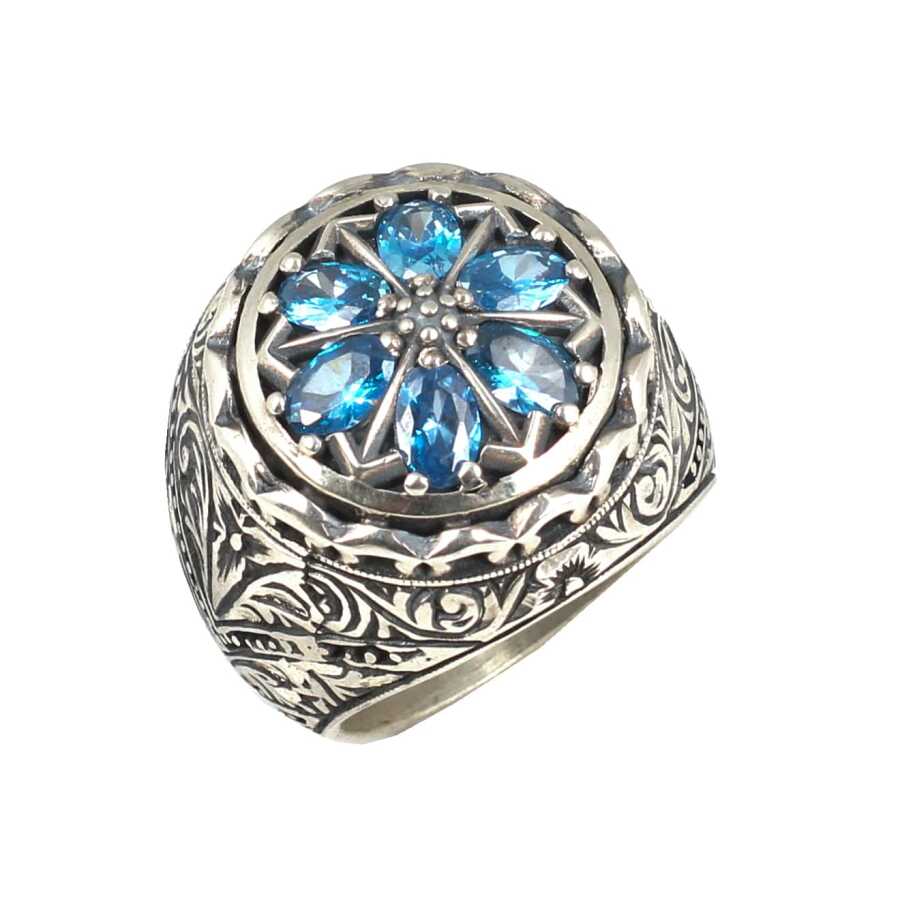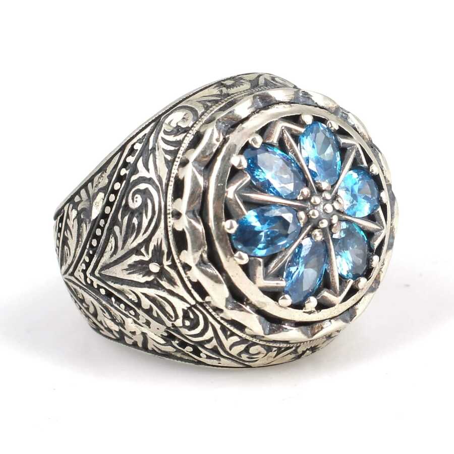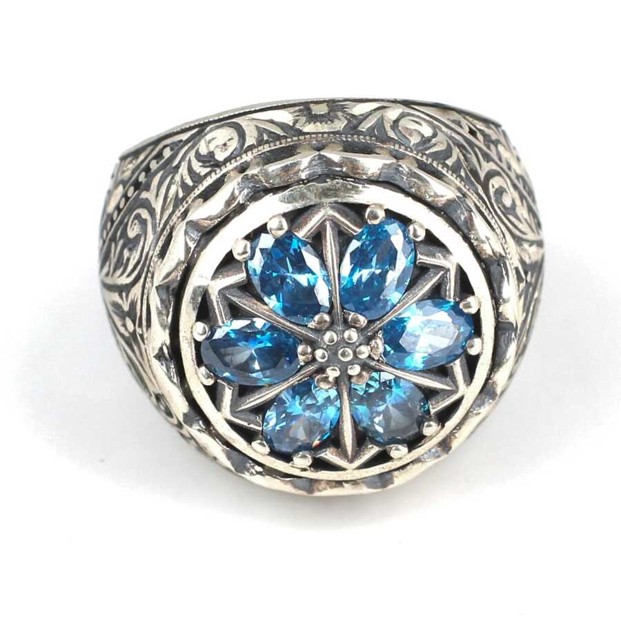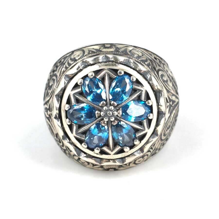 Gelince Haber VerYüzük 925 ayar gümüşten üretilmiştir. Taşlı yüzüğün üst kısmı 2,2 cm boyutlarındadır. Yüzüğün üzerine el kalemi atılmıştır. Resimdeki yüzük 24,5 ölçüdür, ancak tüm ölçüler özel olarak yapılabilmektedir. Yüzük akuamarin renk zirkon taşlıdır. Ağırlığı 28,5 gramdır.