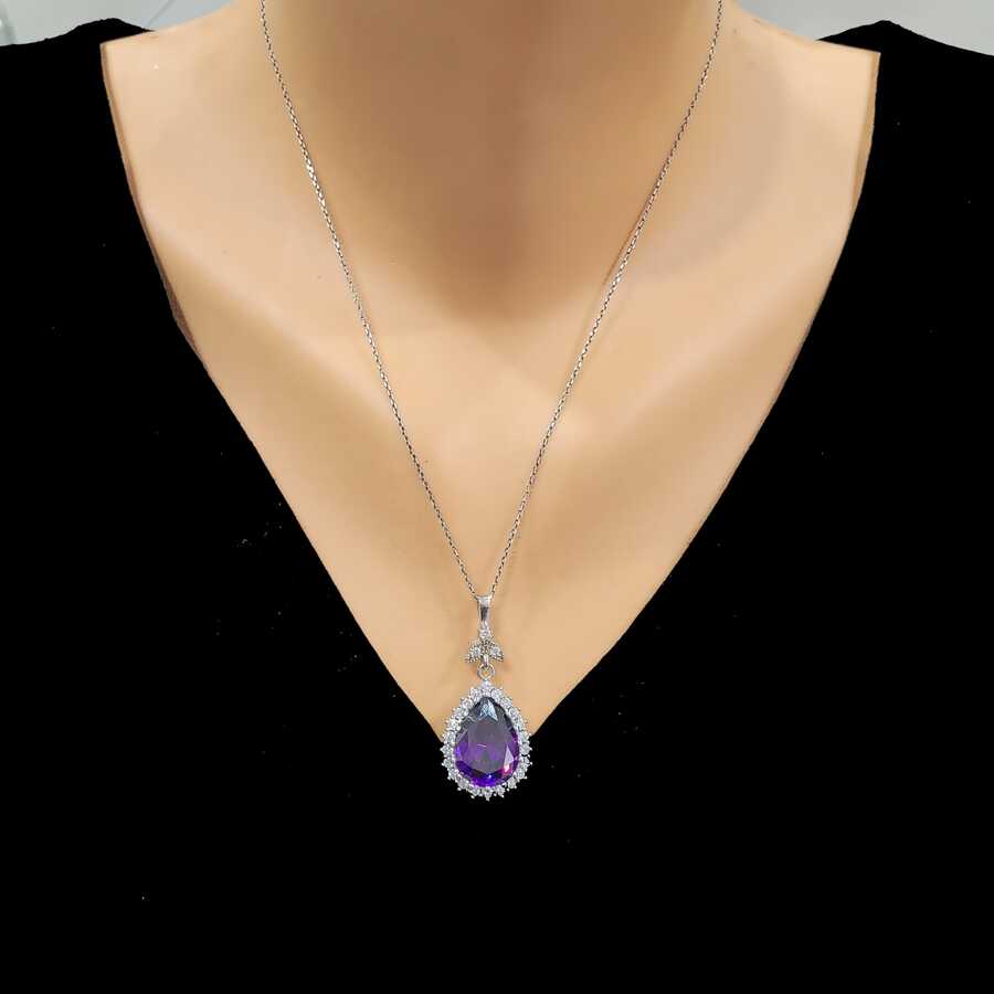 925 Ayar Gümüş Damla Ametist Taşlı Anturaj Kolye