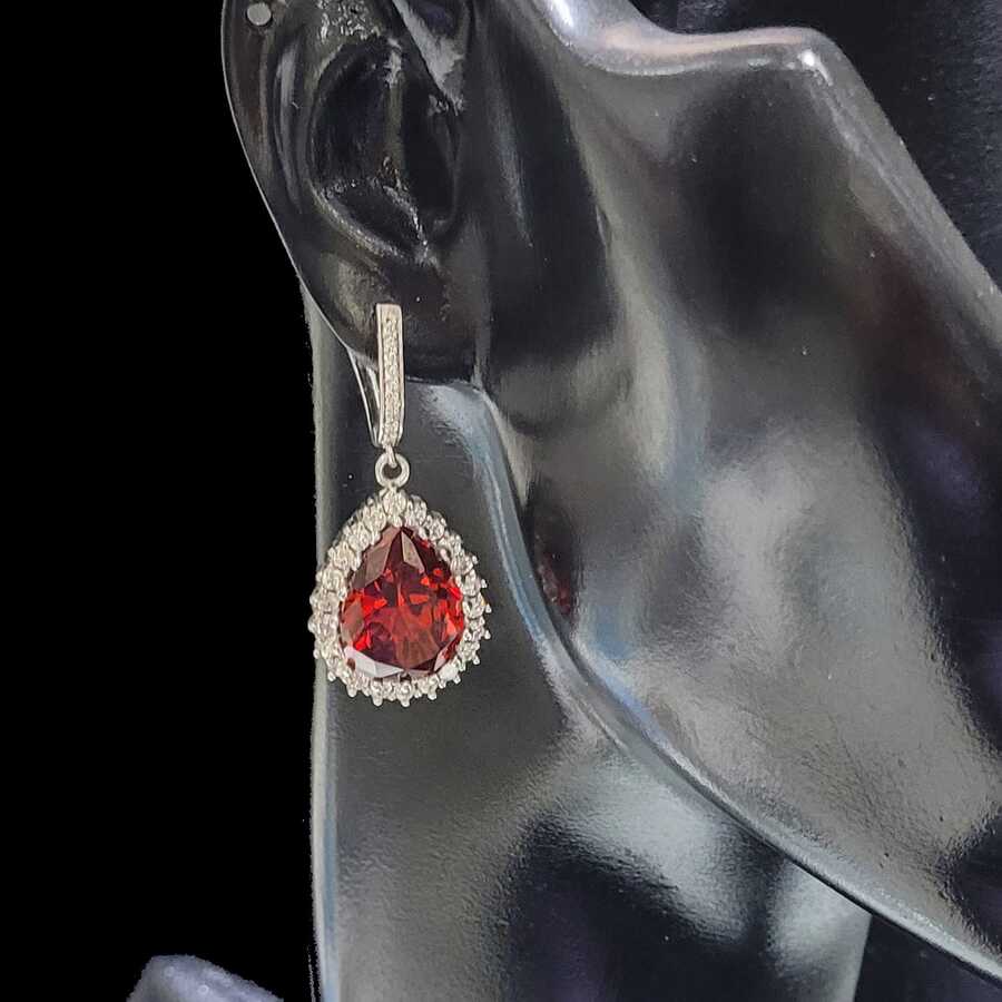 Gümüş küpe 925 ayar gümüşten yapılmıştır. Damla anturaj model sallantılı küpe 1,3 cm'ye 1,8 cm boyutlarındadır. Küpe 4 cm uzunluğundadır. Küpe beyaz zirkon ve garnet taşlıdır. Ağırlığı 19,7 gramdır.