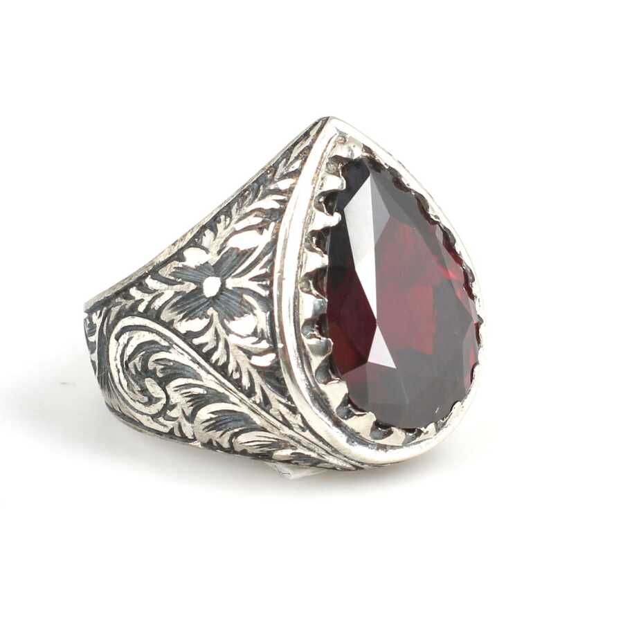 925 Ayar Gümüş Damla Kırmızı Zirkon Taşlı Kalemli Erkek Yüzük