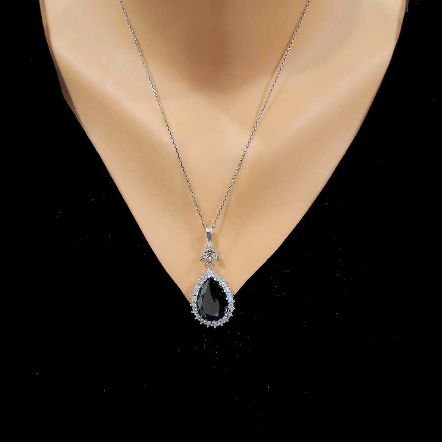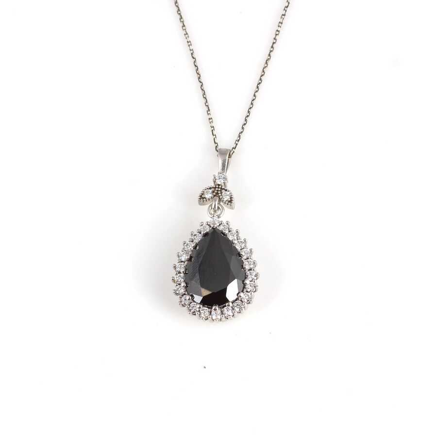 Gümüş kolye 925 ayar gümüşten yapılmıştır. Damla anturaj model kolye 1,3 cm'ye 1,8 cm boyutlarındadır. Gümüş kolye 45 cm uzunluğundadır. Kolye beyaz zirkon ve oniks renk zirkon taşlıdır. Ağırlığı 11,12 gramdır.