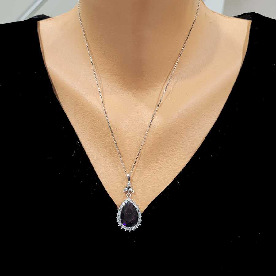 Gümüş kolye 925 ayar gümüşten yapılmıştır. Damla anturaj model kolye 1,3 cm'ye 1,8 cm boyutlarındadır. Gümüş kolye 45 cm uzunluğundadır. Kolye beyaz zirkon ve zultanit taşlıdır. Ağırlığı 8,9 gramdır.