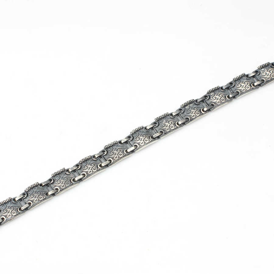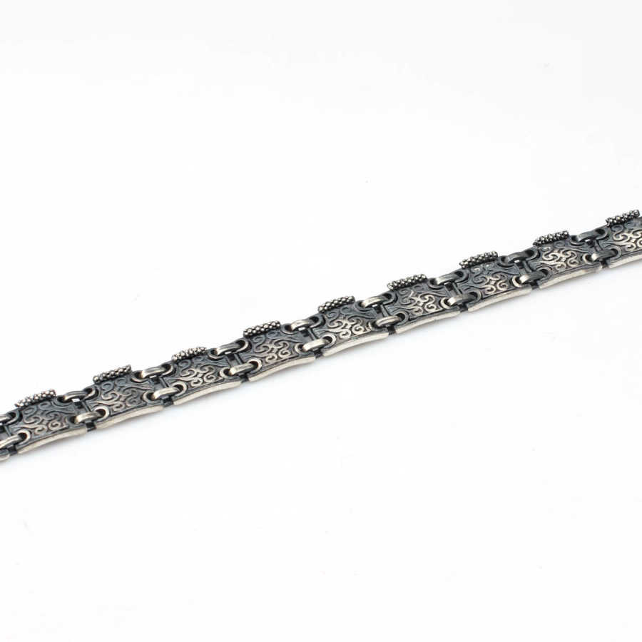 Bileklik 925 ayar gümüşten imal edilmiştir. Antik bileklik 1 cm eninde ve 21 cm uzunluğundadır. Bileklik taşsızdır. Gümüş bileklik 24,43 gram ağırlığındadır.