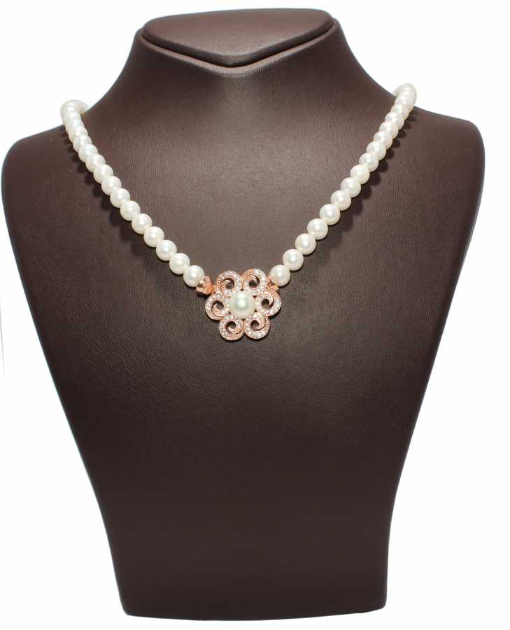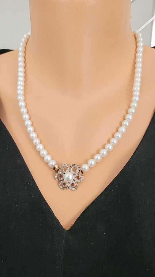 Gümüş kolye 925 ayar gümüşten yapılmıştır. Gümüş kolye 48 cm uzunluğundadır. İnci kolyenin ucunda gümüş papatya figürü vardır. Kolye inci ve zirkon taşlıdır. Ağırlığı 35,47 gramdır.