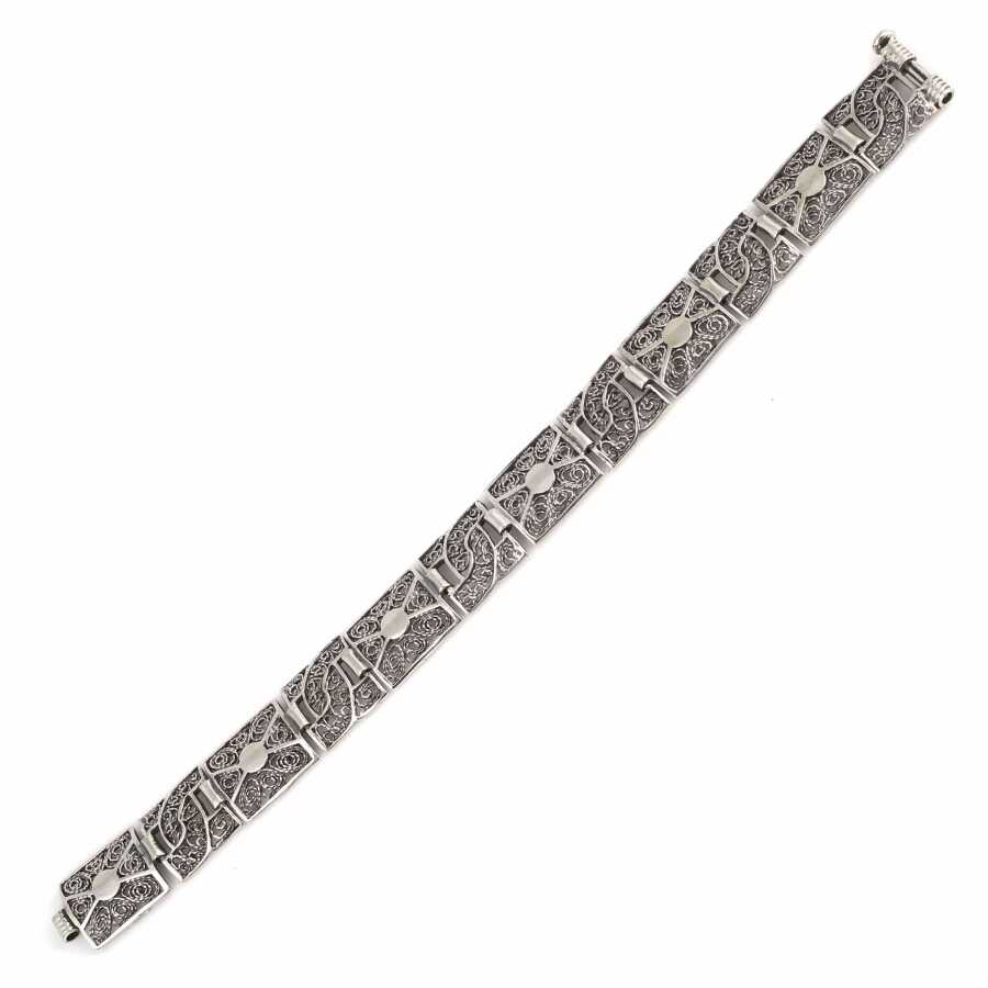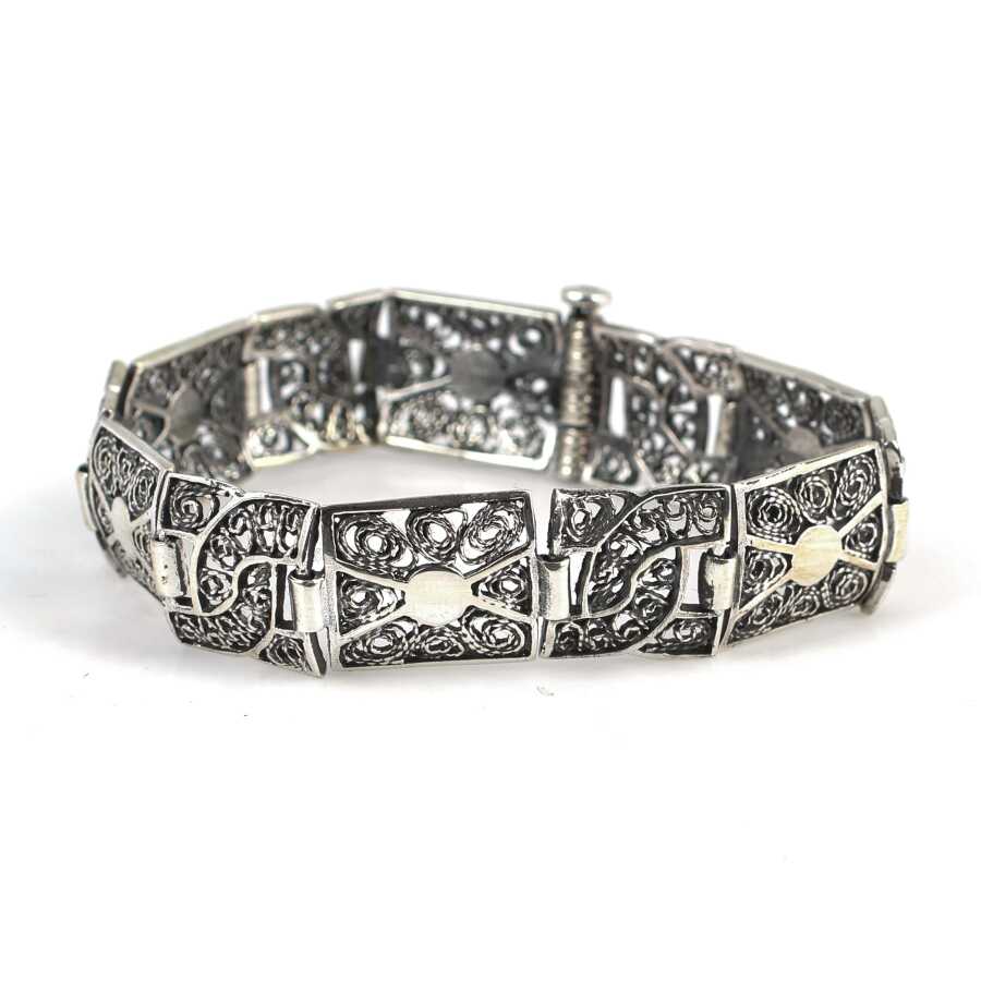 Bileklik 925 ayar gümüşten imal edilmiştir. Taşsız desenli bileklik 1,4 cm eninde ve 19 cm uzunluğundadır. Gümüş desenli bileklik taşsızdır. Gümüş bileklik 18,81 gramdır.