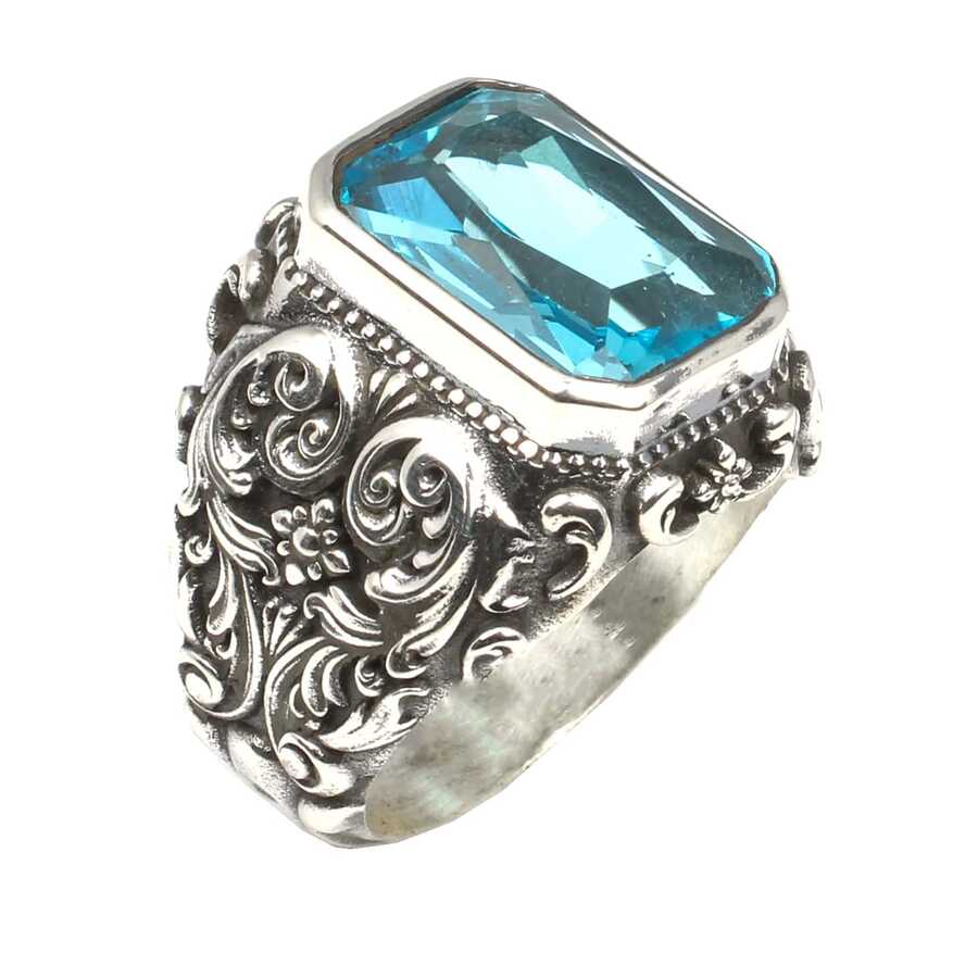 Yüzük 925 ayar gümüşten üretilmiştir. Yüzüğün üzerinde el kalemi atılarak tasarlanmıştır. Taşlı yüzük 1,8 cm'ye 1,4 cm boyutlarındadır. Resimdeki yüzük 24 ölçüdür, ancak tüm ölçüler özel olarak yapılabilmektedir. Yüzük akuamarin renk taşlıdır. Ağırlığı 19,6 gramdır.