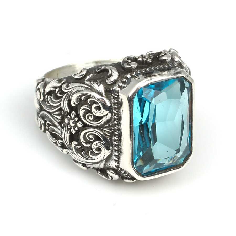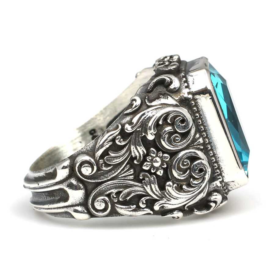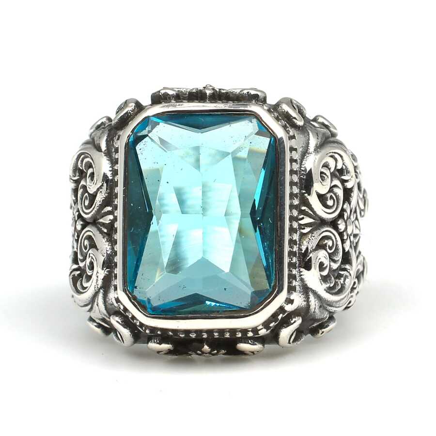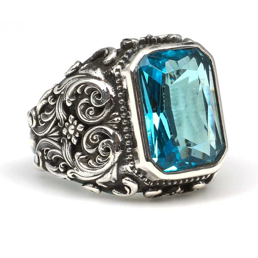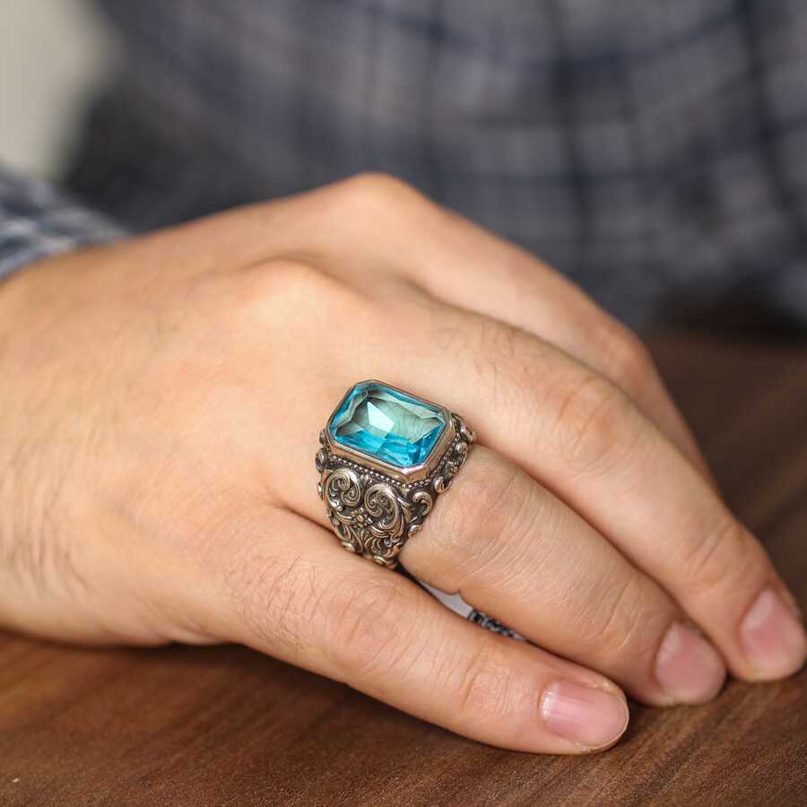 925 Ayar Gümüş Dikdörtgen Mavi Akuamarin Taşlı Erkek Yüzüğü