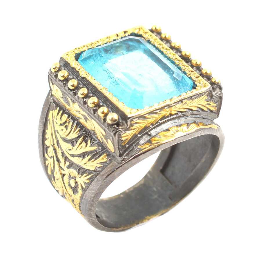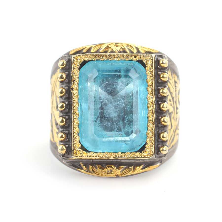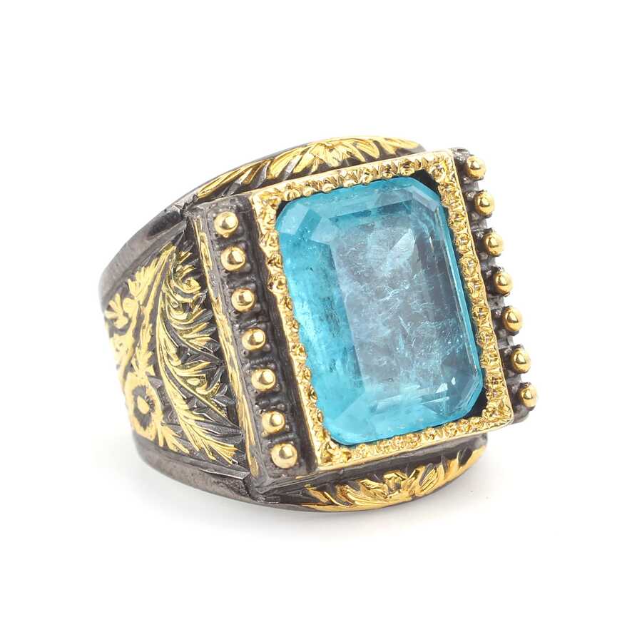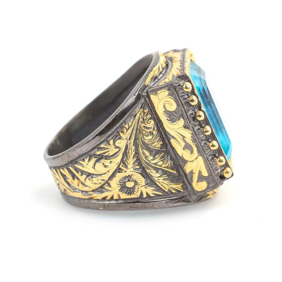 Yüzük 925 ayar gümüşten üretilmiştir. Yüzüğün üzerinde el kalemi atılarak tasarlanmıştır. Taşlı yüzük 1,6 cm'ye 1,2 cm boyutlarındadır. Resimdeki yüzük 25 ölçüdür, ancak tüm ölçüler özel olarak yapılabilmektedir. Yüzük akuamarin renk taşlıdır. Ağırlığı 15,01 gramdır.