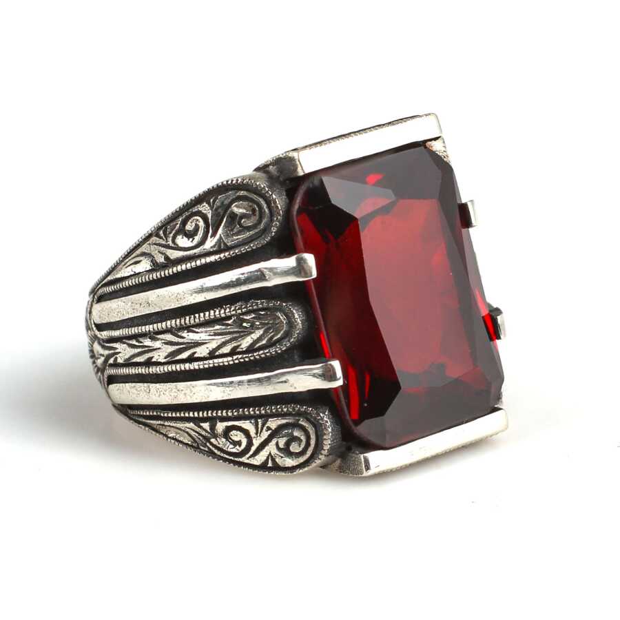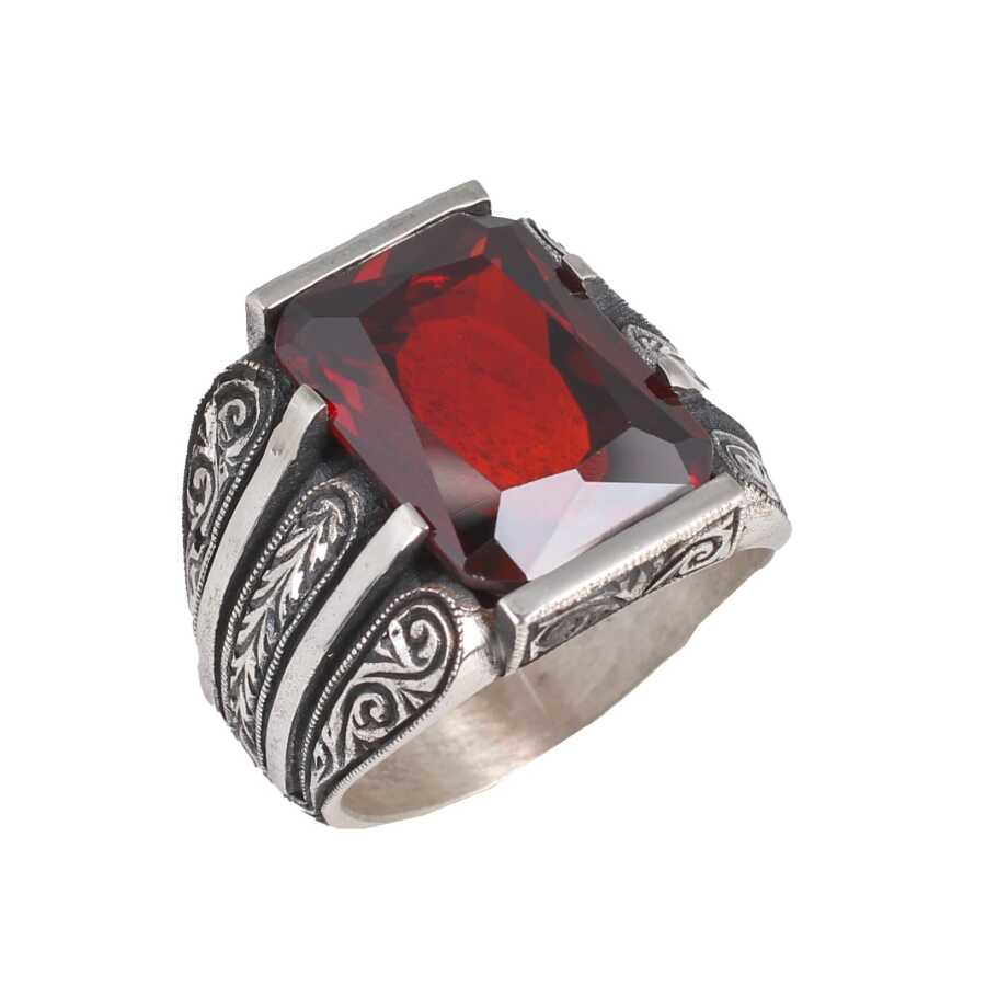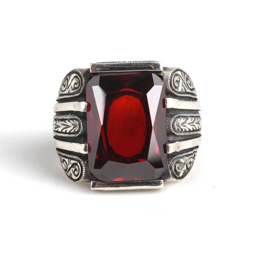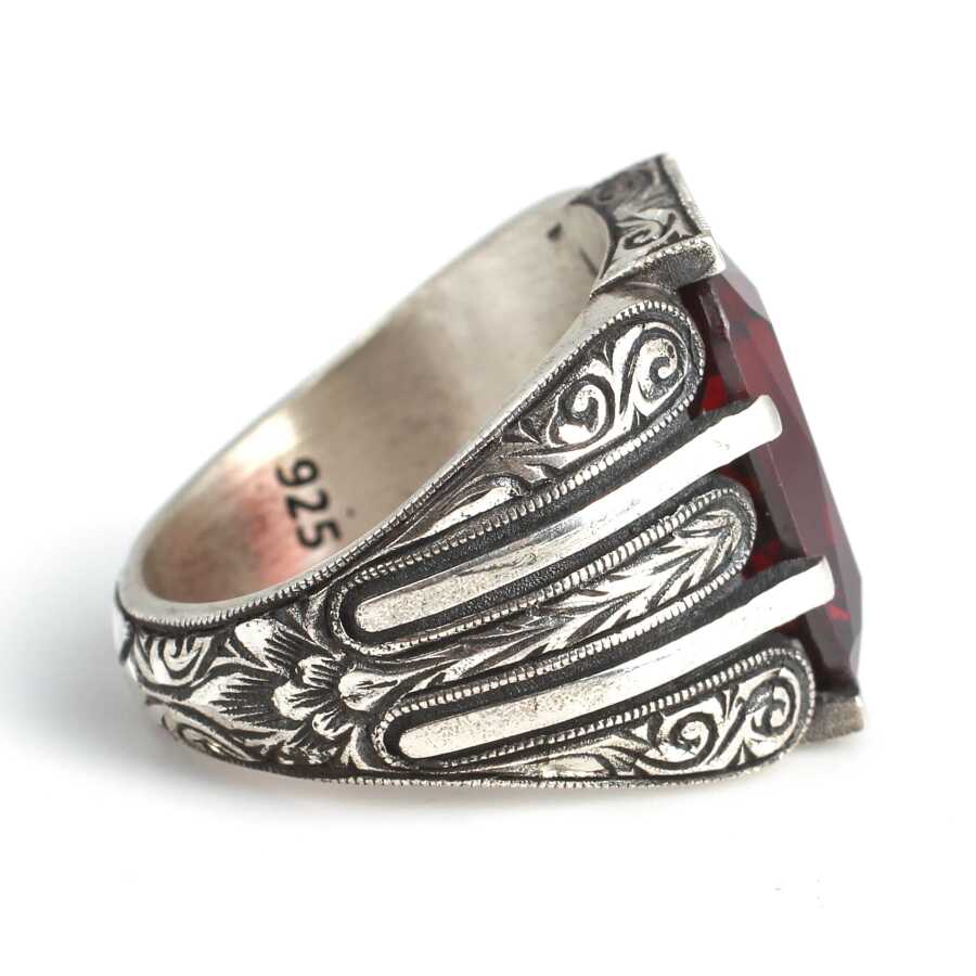 Yüzük 925 ayar gümüşten üretilmiştir Yüzüğün üzerinde el kalemi atılarak tasarlanmıştır. Taşlı yüzük 1,6 cm'ye 1,2 cm boyutlarındadır. Resimdeki yüzük 25 ölçüdür, ancak tüm ölçüler özel olarak yapılabilmektedir. Yüzük garnet taşlıdır. Ağırlığı 21,37 gramdır.