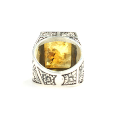 Yüzük 925 ayar gümüşten üretilmiştir. Yüzüğün üzerinde el kalemi atılarak tasarlanmıştır. Taşlı yüzük 2,1 cm'ye 1,8 cm boyutlarındadır. Resimdeki yüzük 24 ölçüdür, ancak tüm ölçüler özel olarak yapılabilmektedir. Yüzük sıkma kehribar taşlıdır. Ağırlığı 23,95 gramdır.