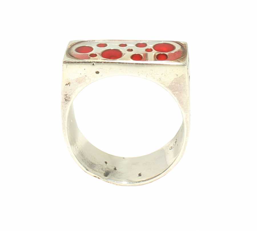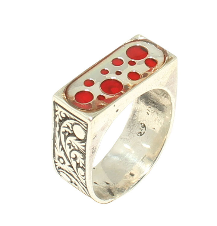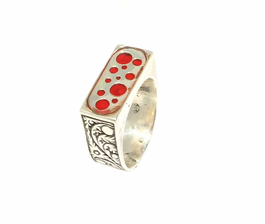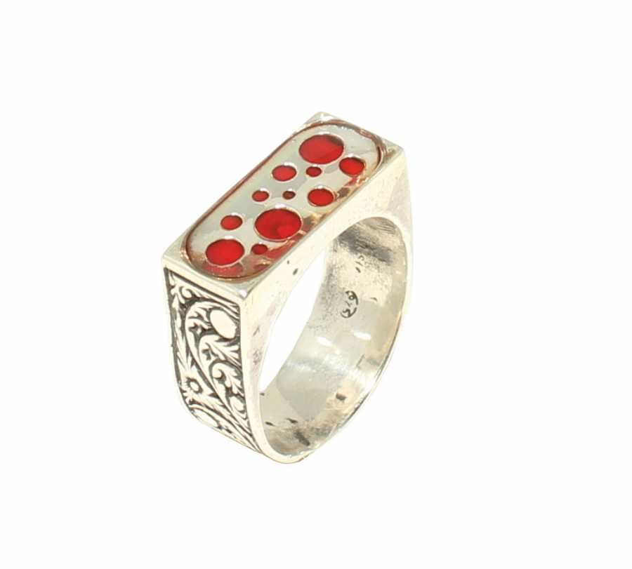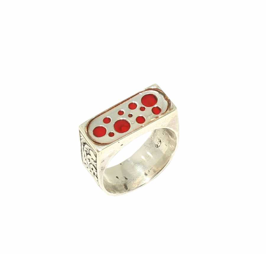 Yüzük 925 ayar gümüşten üretilmiştir. Gümüş yüzüğün üst kısmı kırmızı renk mine yapılmıştır. Yüzüğün üst kısmı 2,1 cm'ye 1,9 cm boyutlarındadır. Resimdeki yüzük 23 ölçüdür, ancak tüm ölçüler yapılabilmektedir. Yüzük taşsızdır. Ağırlığı 11,32 gramdır.