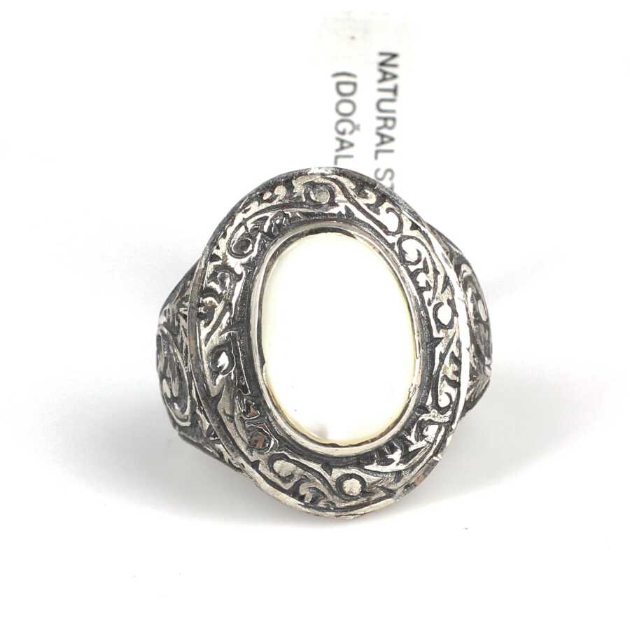 925 ayar gümüştür. Gümüş erkek yüzüğün üst kısmı 2,3 cm'ye 1,8 cm boyutlarındadır. Yüzüğün taş yuvası 1,6 cm'ye 1,1 cm boyutlarındadır. Resimdeki yüzüğün ölçüsü 21 ölçüdür. Yüzük sedef taşlıdır. Gramı: 10,67 gr