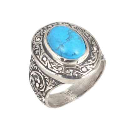 925 Ayar Gümüş Dikdörtgen Oval Turkuaz Taşlı Kalemli Erkek Yüzük
