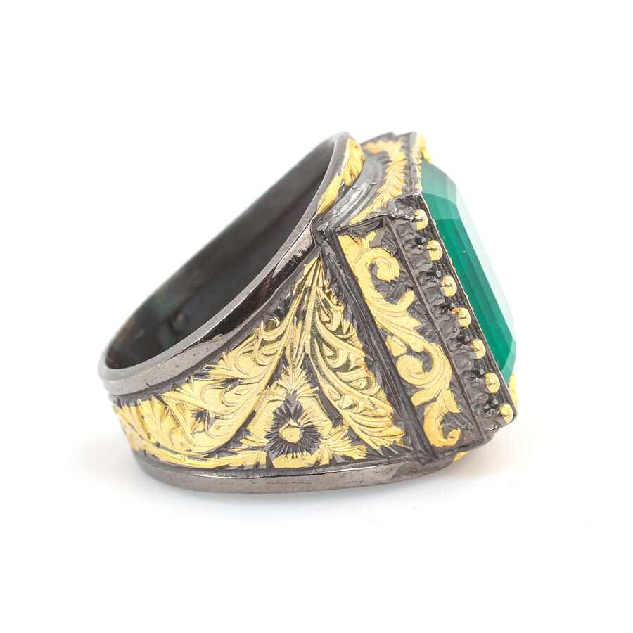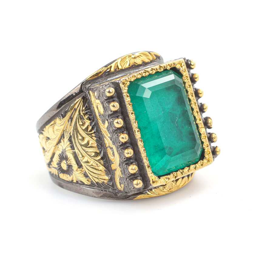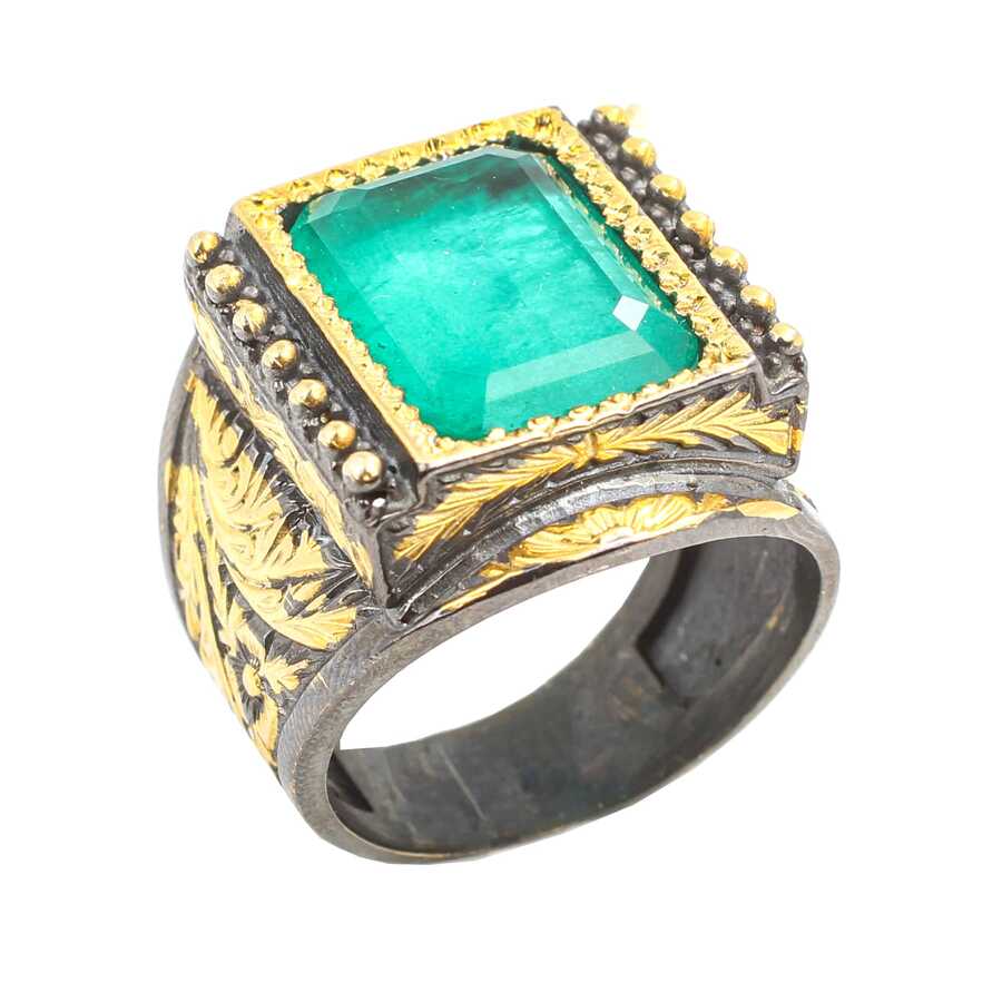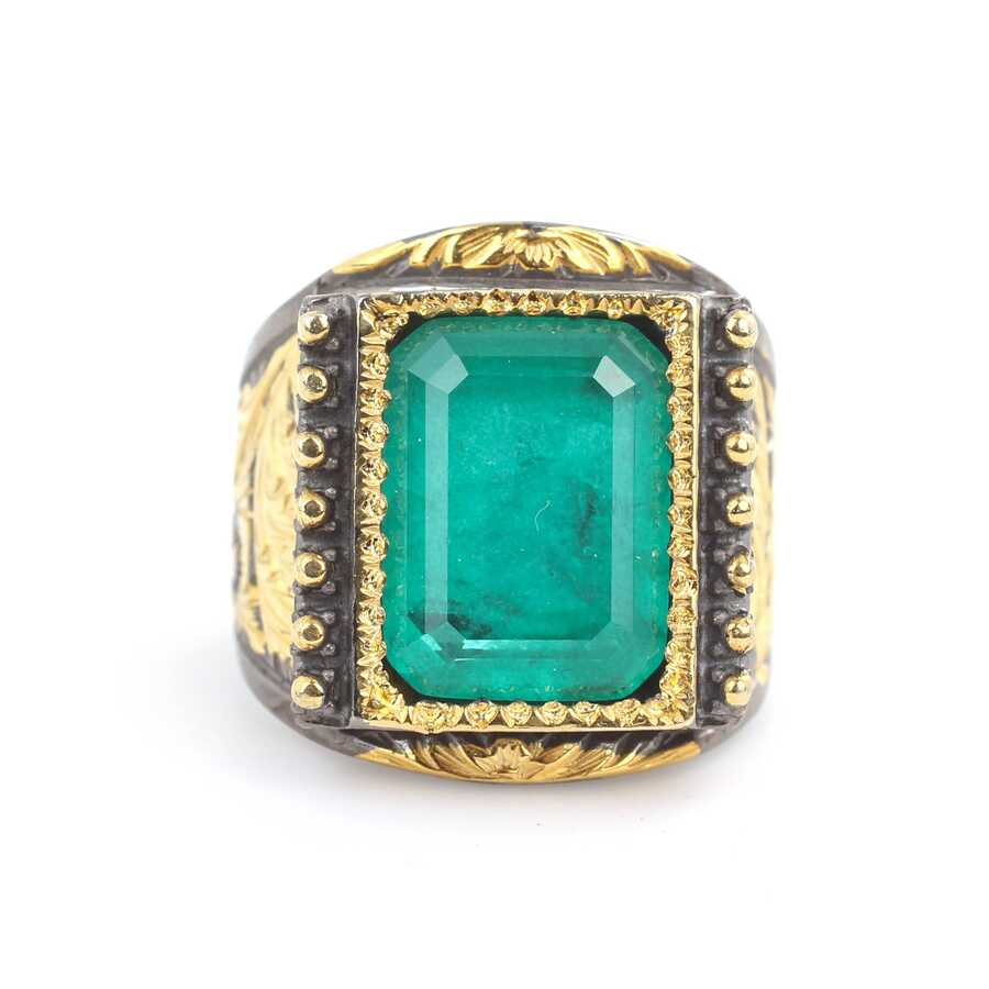 Yüzük 925 ayar gümüşten üretilmiştir. Yüzüğün üzerinde el kalemi atılarak tasarlanmıştır. Taşlı yüzük 1,6 cm'ye 1,2 cm boyutlarındadır. Resimdeki yüzük 24 ölçüdür, ancak tüm ölçüler özel olarak yapılabilmektedir. Yüzük zümrüt renk taşlıdır. Ağırlığı 15,39 gramdır.