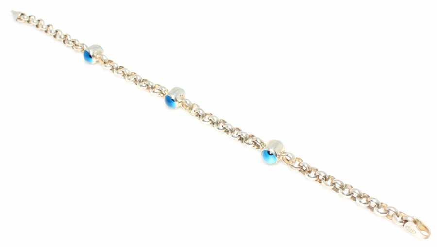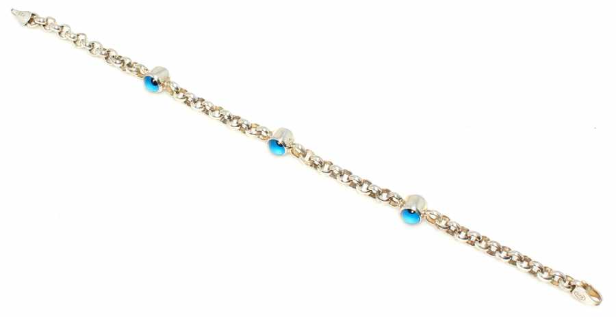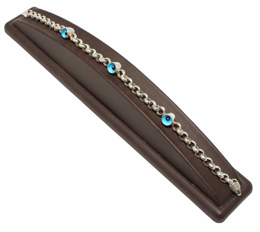 Bileklik 925 ayar gümüşten imal edilmiştir. Nazar boncuk şeklindeki doç zincirli bileklik 0,7 cm boyutunda ve 20 cm uzunluğundadır. Gümüş bileklik 12,6 gram ağırlığındadır.