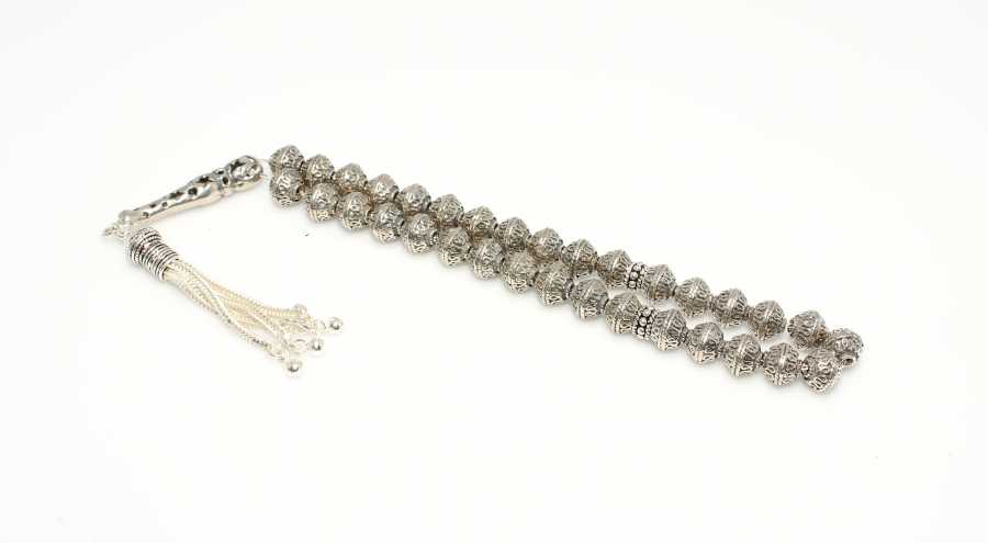 Küre kesim gümüş tesbih topu 0,7 cm boyutlarındadır. Tespih toplam uzunluğu 19 cm'dir. Tespihin ağırlığı 34,81 gramdır.