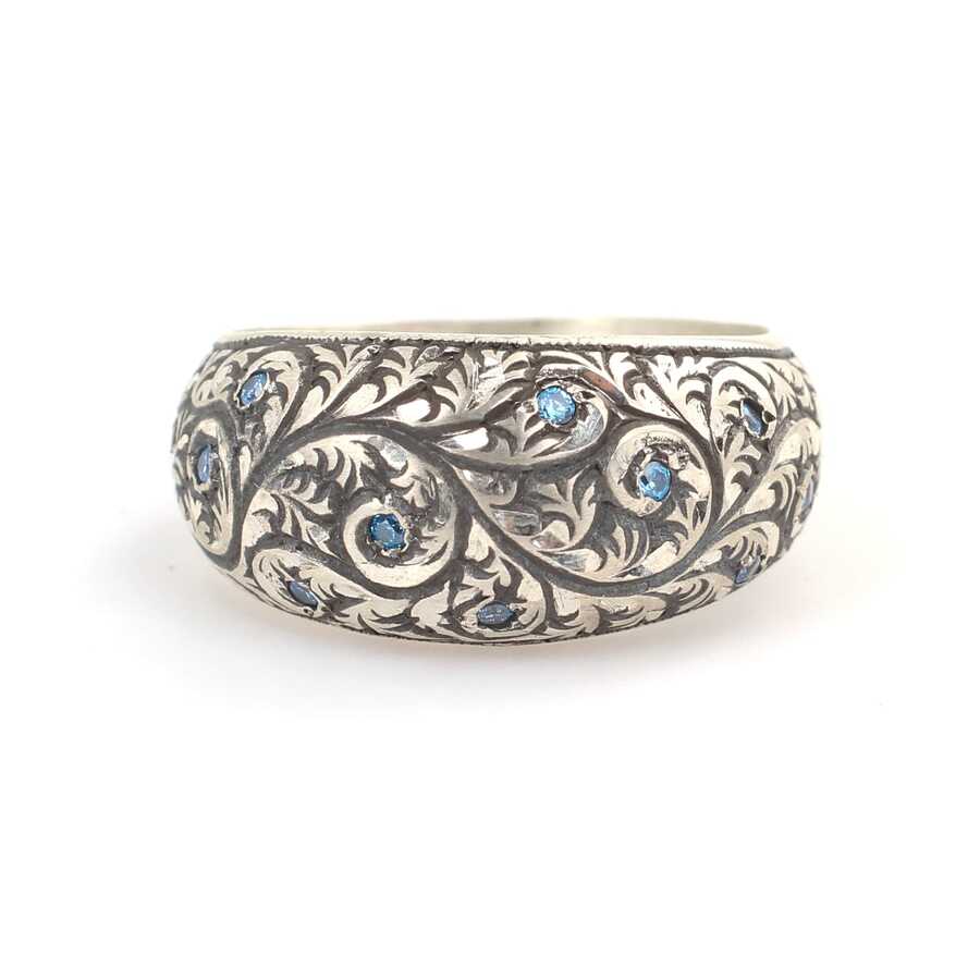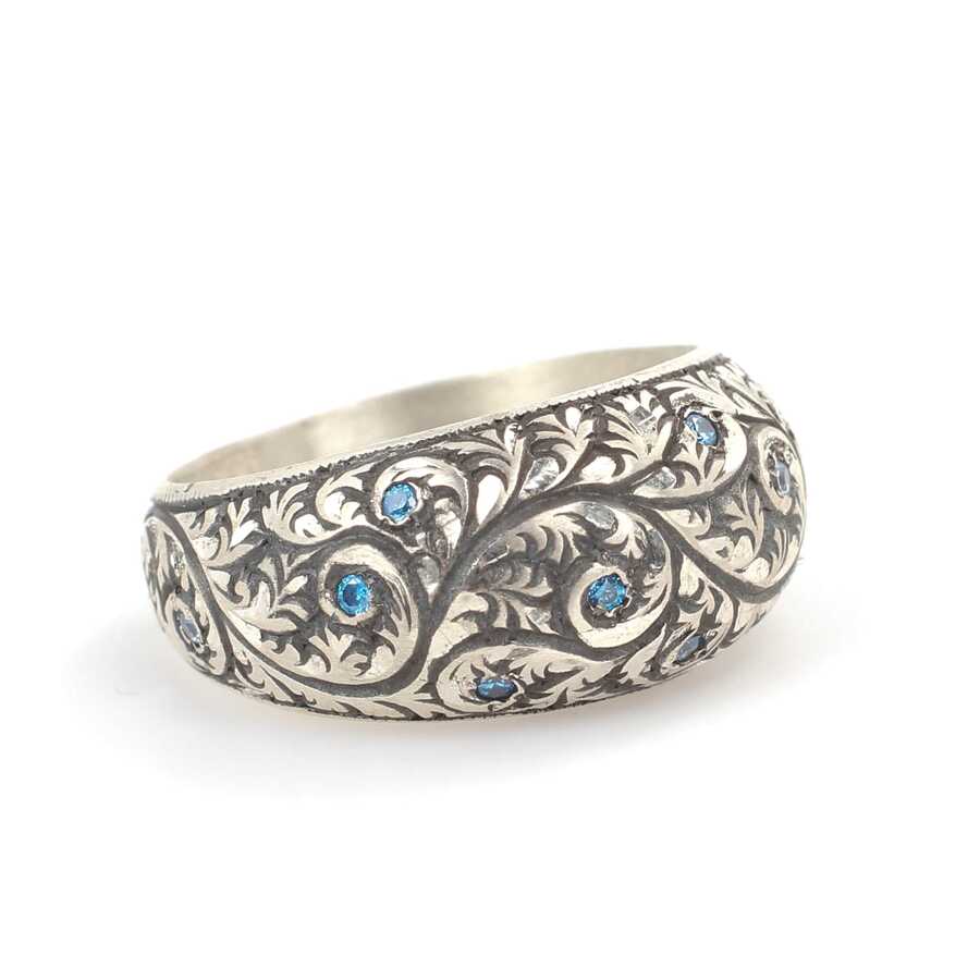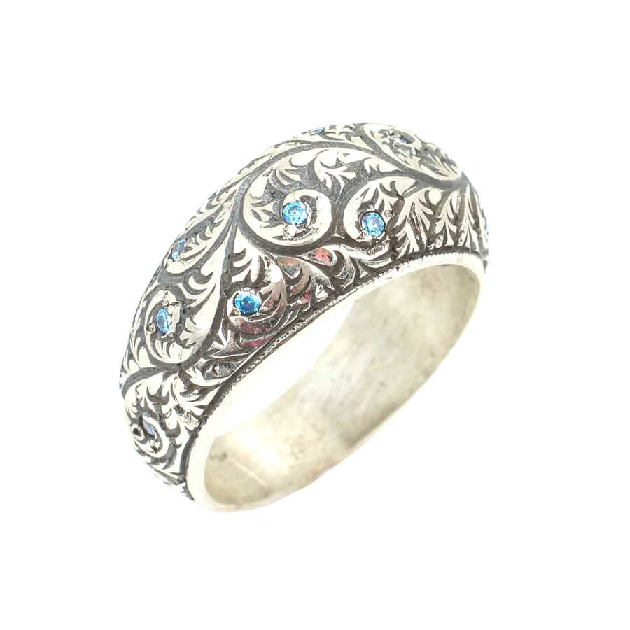 Yüzük 925 ayar gümüşten üretilmiştir. Yüzüğün üzerinde el kalemi atılarak tasarlanmıştır. Taşlı yüzük 1,2 cm boyutlarındadır. Resimdeki yüzük 24 ölçüdür, ancak tüm ölçüler özel olarak yapılabilmektedir. Yüzük akuamarin renk zirkon taşlıdır. Ağırlığı 11,92 gramdır.