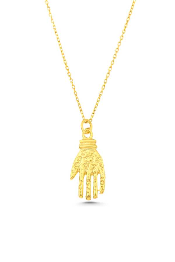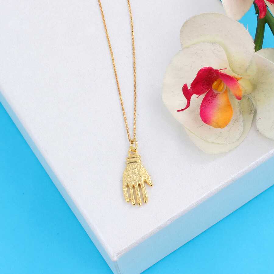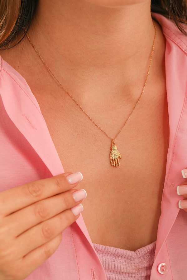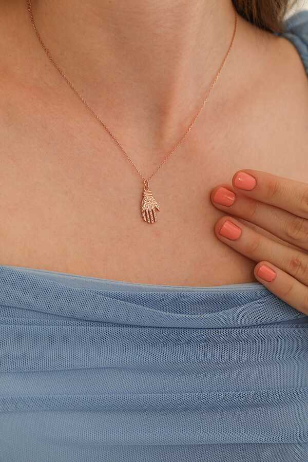Gümüş kolye 925 ayar gümüşten yapılmıştır. Fatma eli kolye 2,2 cm'ye 1,1 cm boyutlarındadır. Zinciri 46 cm uzunluğundadır. Kolye taşsızdır. Ağırlığı 3,4 gramdır.
