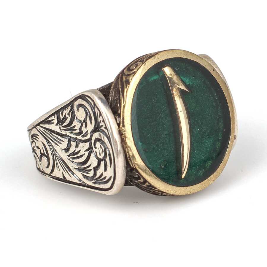 925 Ayar Gümüş Elif Harfli Yeşil Mineli Erkek Yüzük