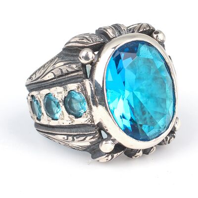 WGEYZ1797 - 925 Ayar Gümüş Elişi Kalemli Akuamarin Taşlı Erkek Yüzük