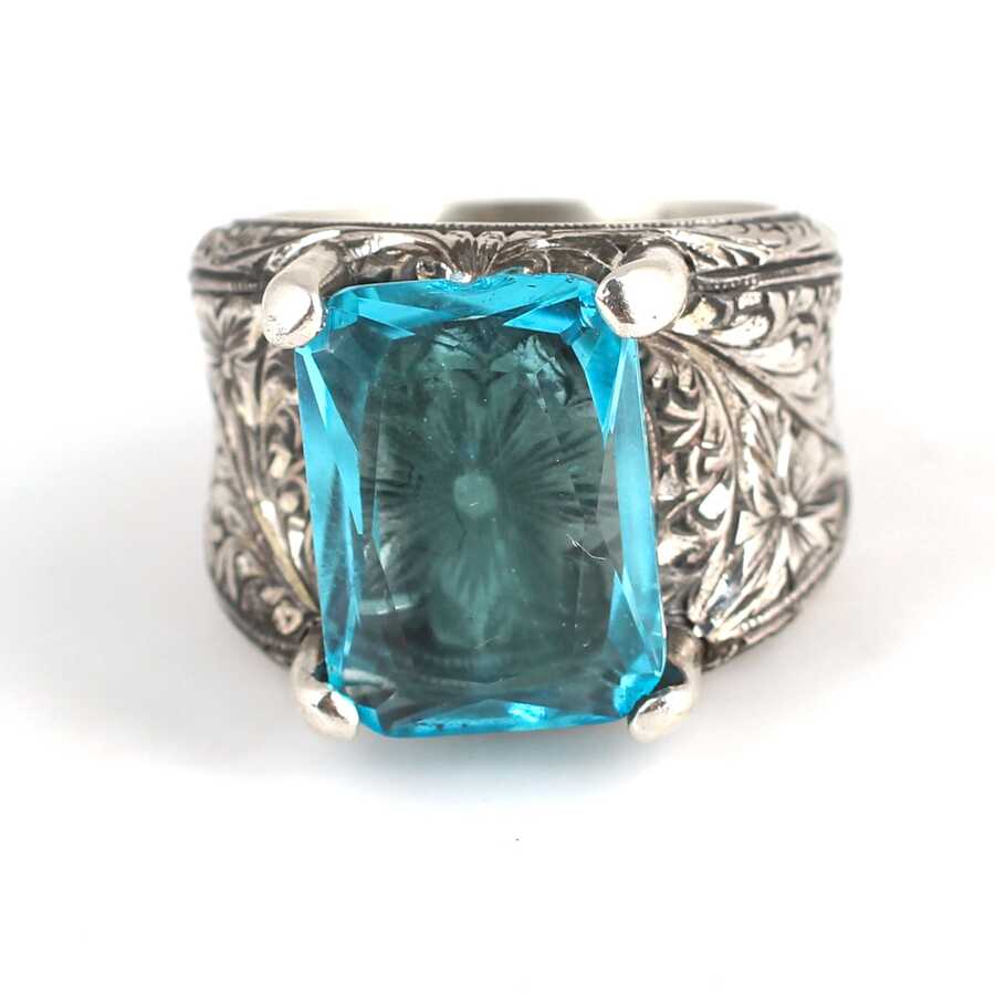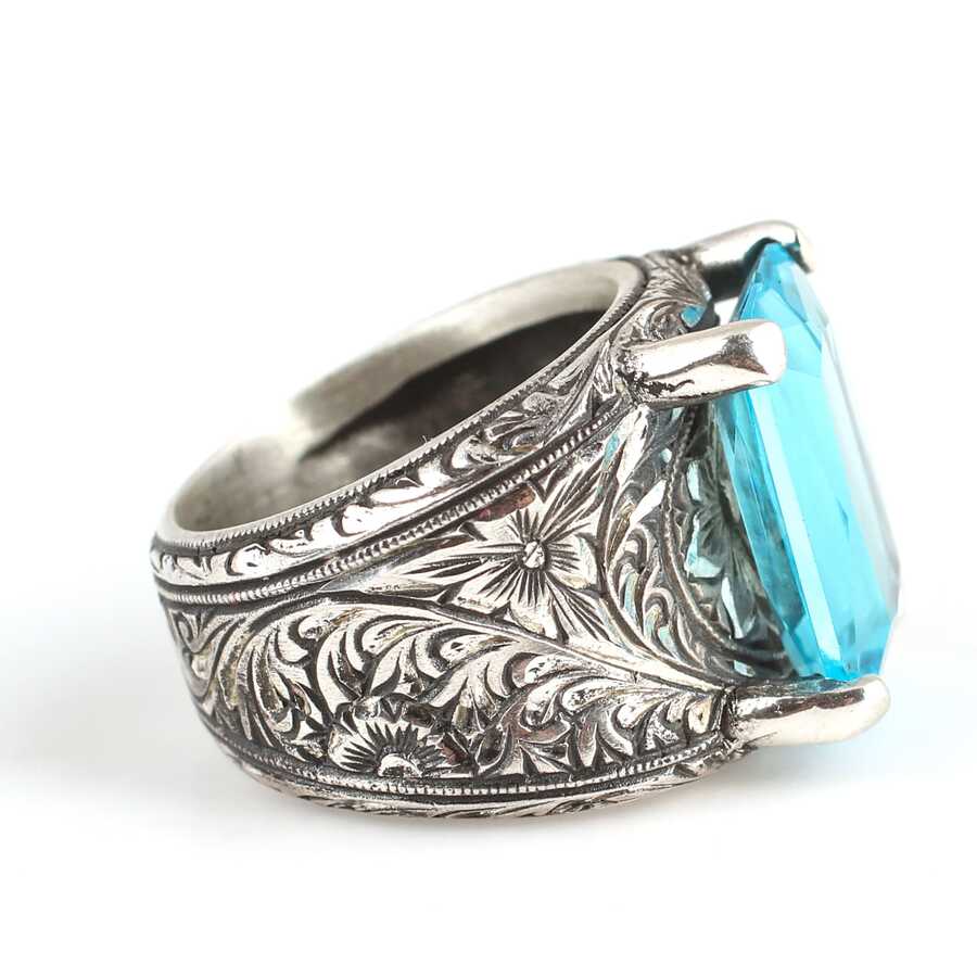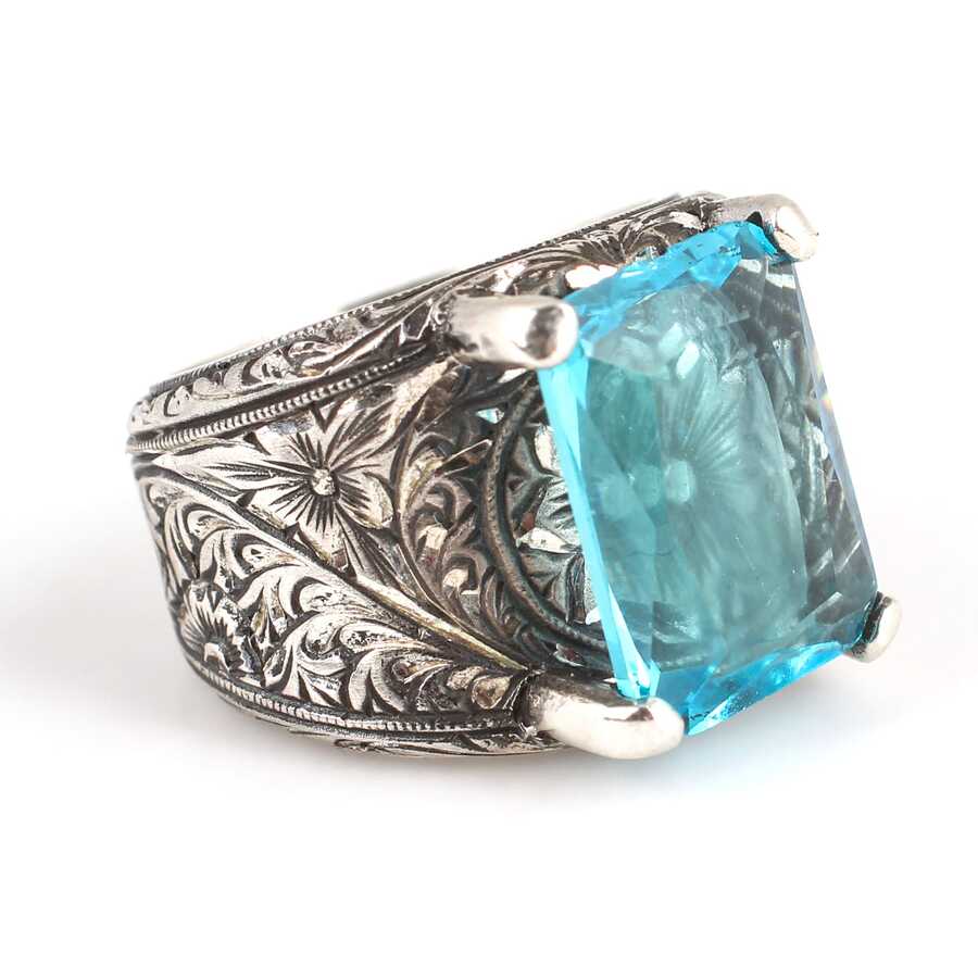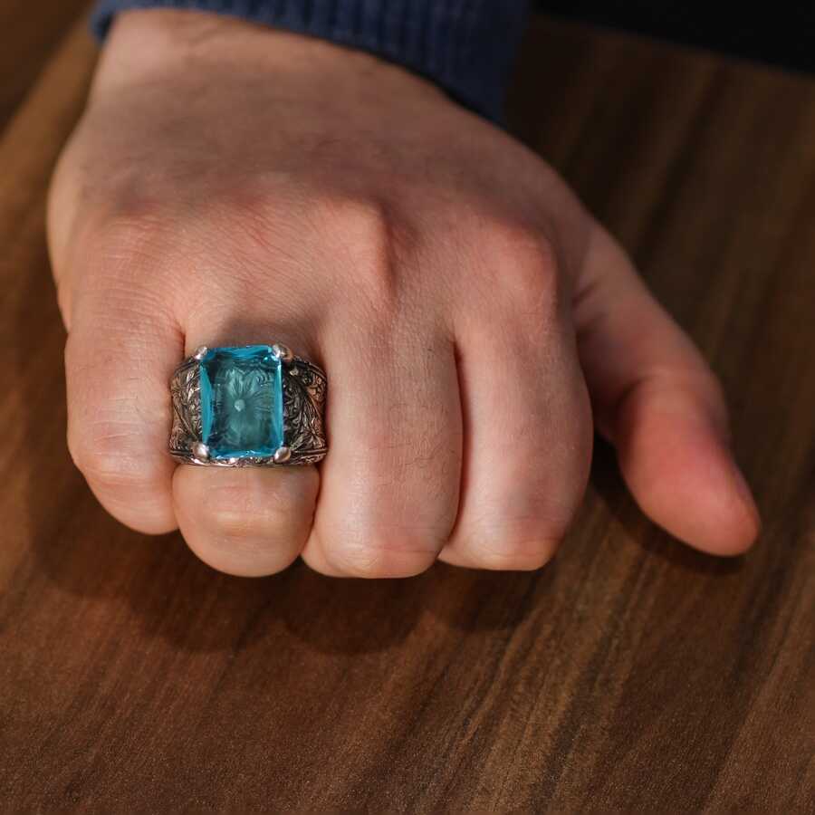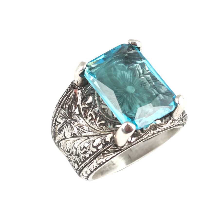 Yüzük 925 ayar gümüşten üretilmiştir. Yüzüğün üzerinde el kalemi atılarak tasarlanmıştır. Taşlı yüzük 1,8 cm'ye 1,3 cm boyutlarındadır. Resimdeki yüzük 23 ölçüdür, ancak tüm ölçüler özel olarak yapılabilmektedir. Yüzük akuamarin renk taşlıdır. Ağırlığı 20,43 gramdır.