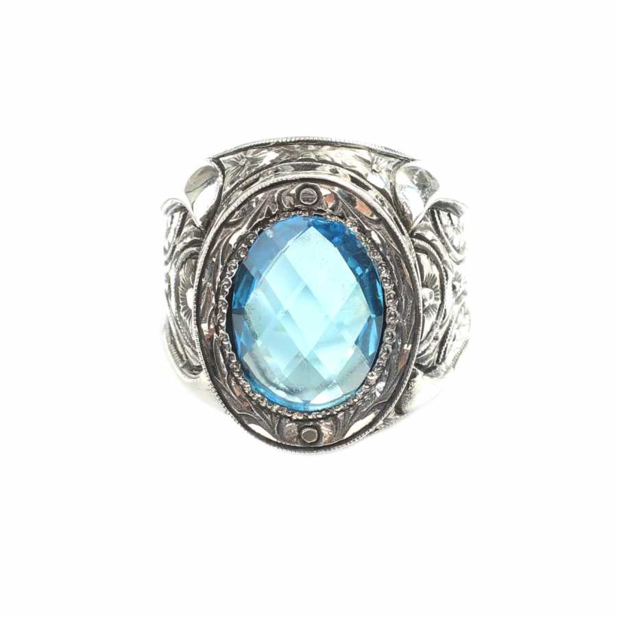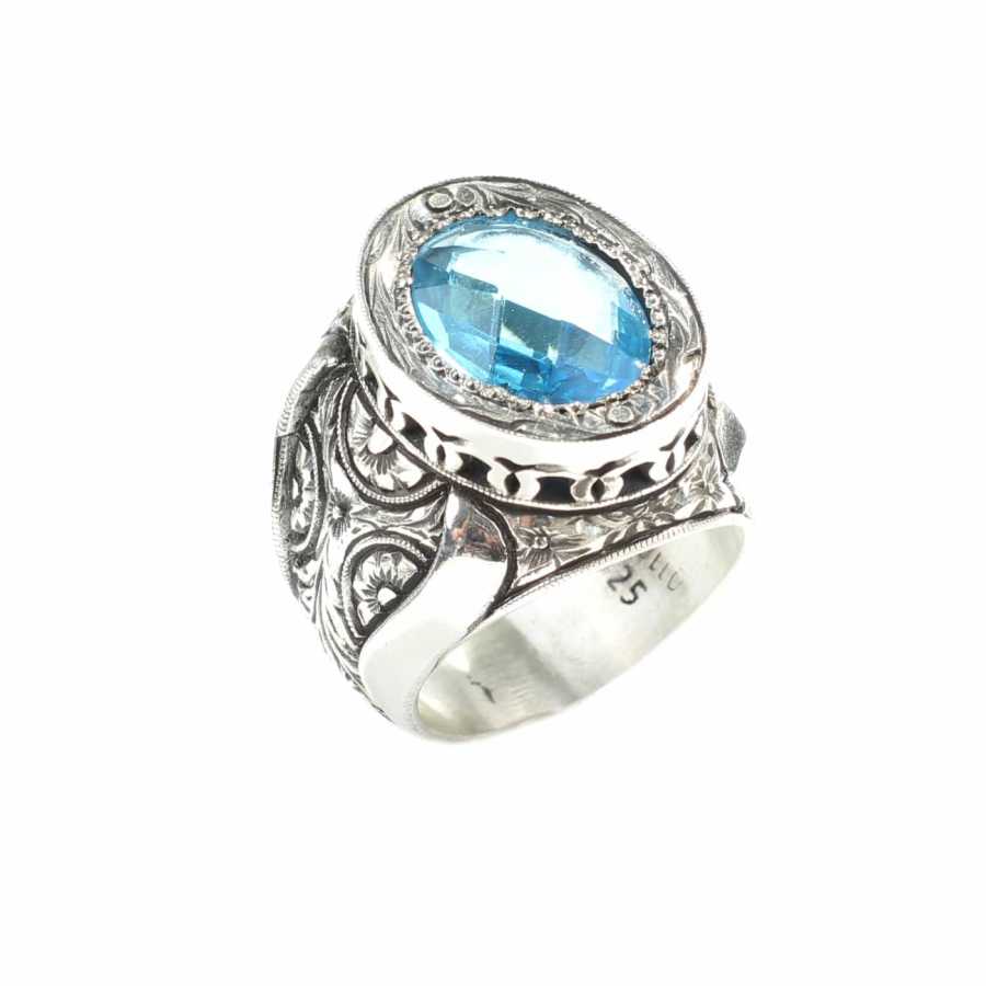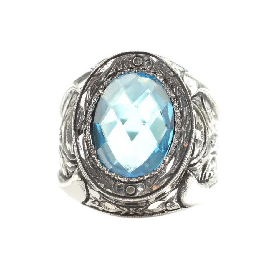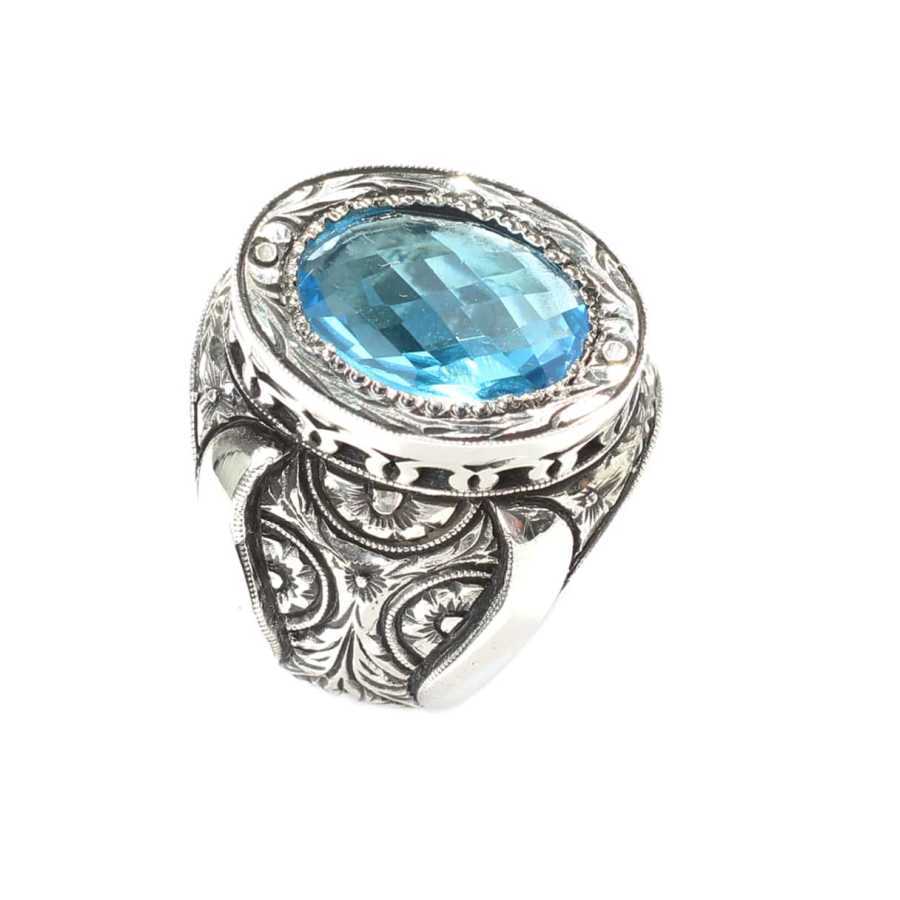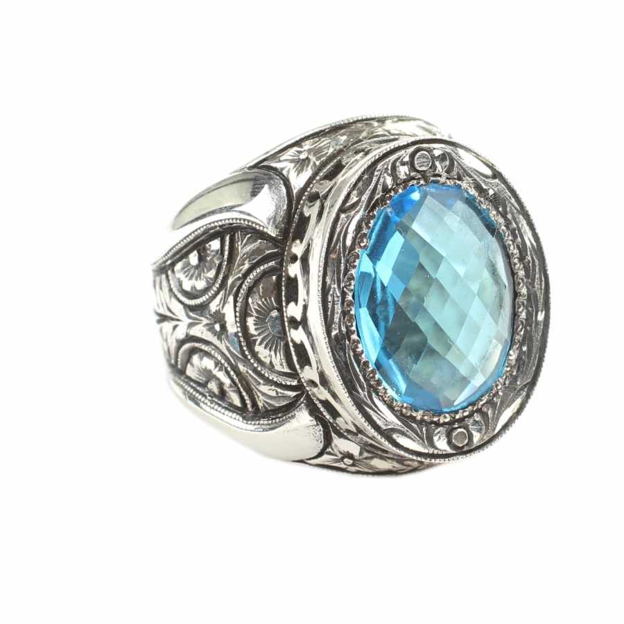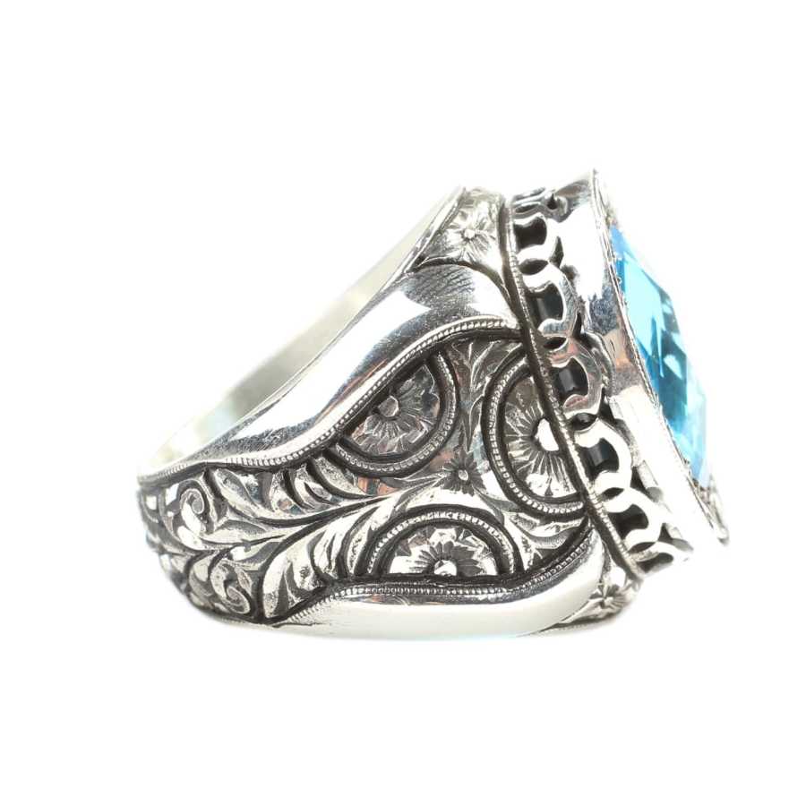 925 Ayar Gümüş Elişi Kalemli Gül Oyma Motifli Akuamarin Mavi Taşlı Erkek Yüzük