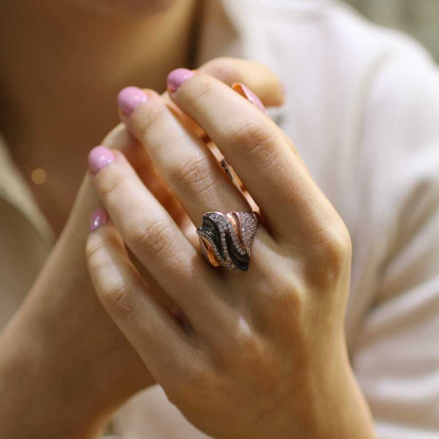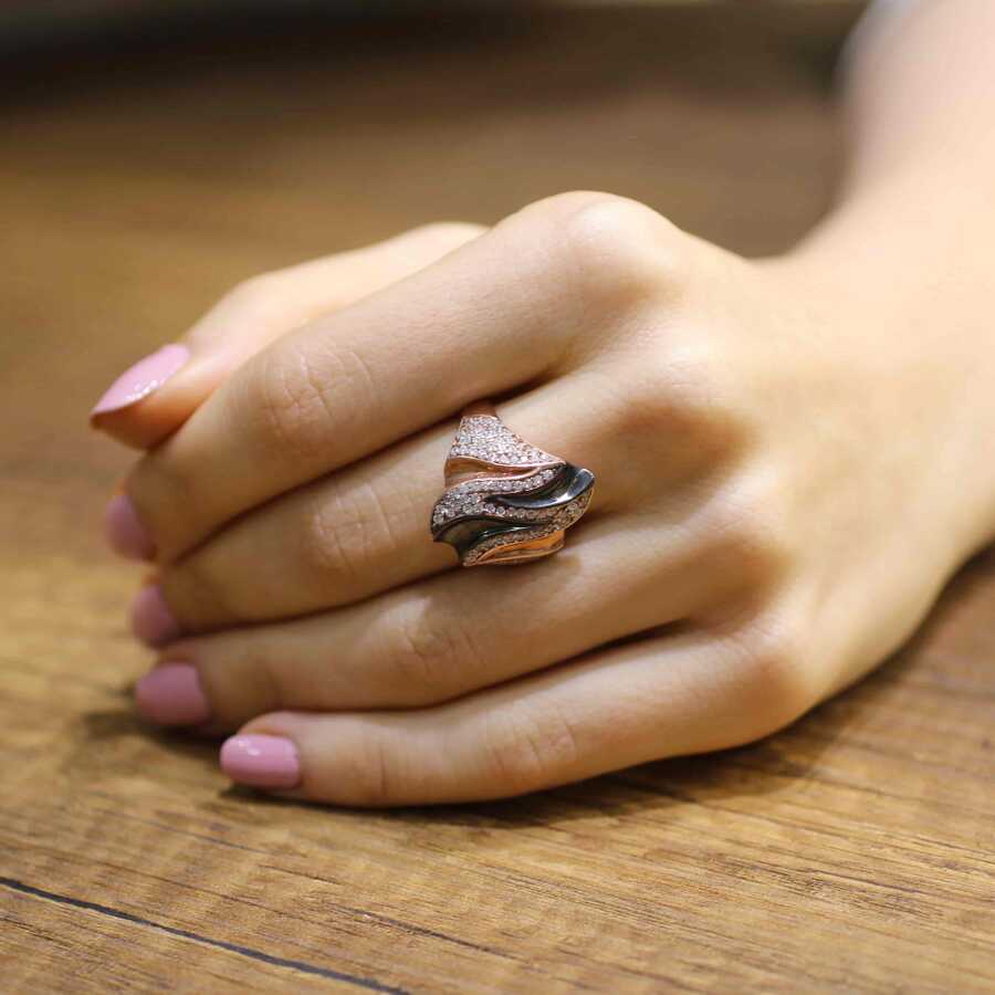 Yüzük 925 ayar gümüşten üretilmiştir. Es motifli yüzük 2,3 cm enindedir. Resimdeki yüzük 18 ölçüdür, ancak tüm ölçüler yapılabilmektedir. Rose renk rodajlıdır. Yüzük zirkon taşlıdır. Ağırlığı 5,4 gramdır.