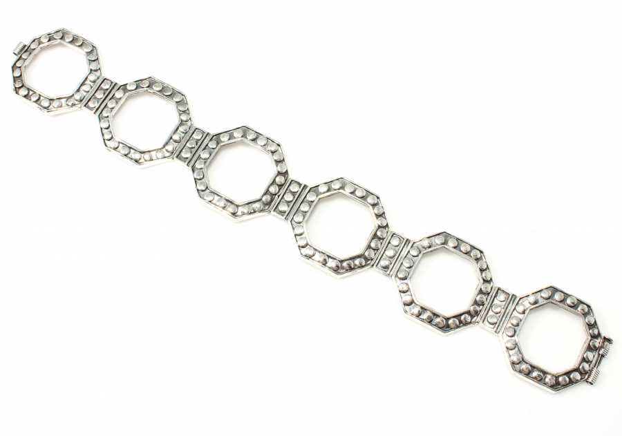 Bileklik 925 ayar gümüşten imal edilmiştir. Sekizgen şeklindeki bileklik 2,9 cm enindedir. Fantezi bileklik 21 cm uzunluğundadır. Bileklik taşsızdır. Gümüş bileklik 34,01 gram ağırlığındadır.