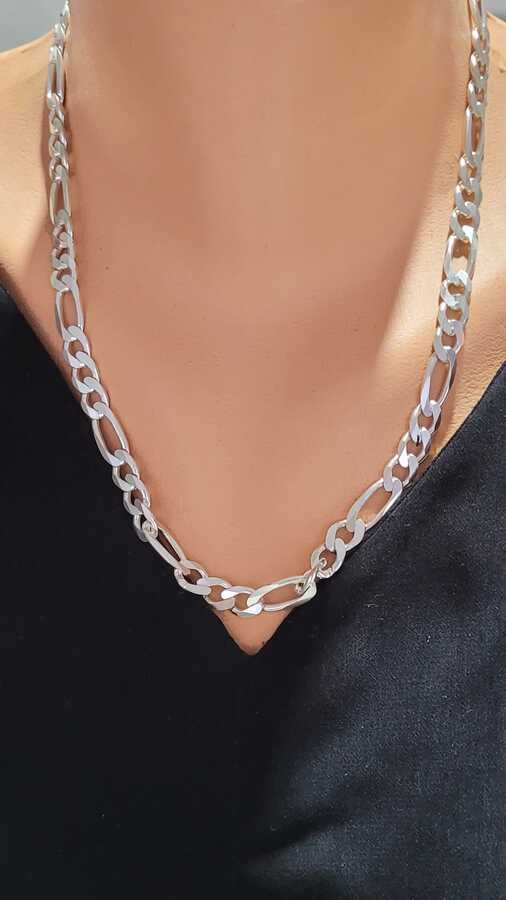 Gümüş kolye 925 ayar gümüşten yapılmıştır. Figaro zincir kolye 50 cm uzunluğundadır. Kolye 0,75 cm enindedir. Kolye taşsızdır. Ağırlığı 35,71 gramdır.