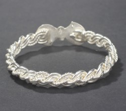 Bilezik 925 ayar gümüşten imal edilmiştir. Fiyonk kaşlı el kalemli model bilezik 6 cm çapındadır. Bileziğin kolları altı tel burma ve taşsızıdır. Gümüş 35,6 gram ağırlığındadır. Bilezik el işçiliği ile üretildiği için gramlarda değişiklik olabilmektedir.