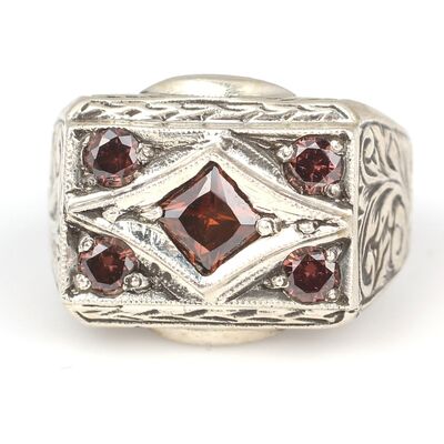 Yüzük 925 ayar gümüşten üretilmiştir. Yüzüğün üzerinde el kalemi atılarak tasarlanmıştır. Taşlı yüzük 1,8 cm'ye 1,1 cm boyutlarındadır. Resimdeki yüzük 22 ölçüdür, ancak tüm ölçüler özel olarak yapılabilmektedir. Yüzük garnet renk zirkon taşlıdır. Ağırlığı 14,54 gramdır.
