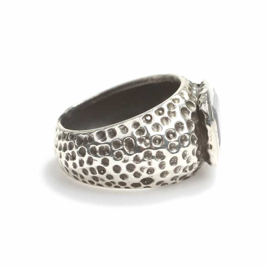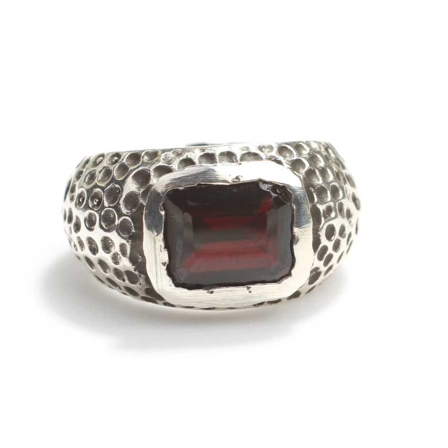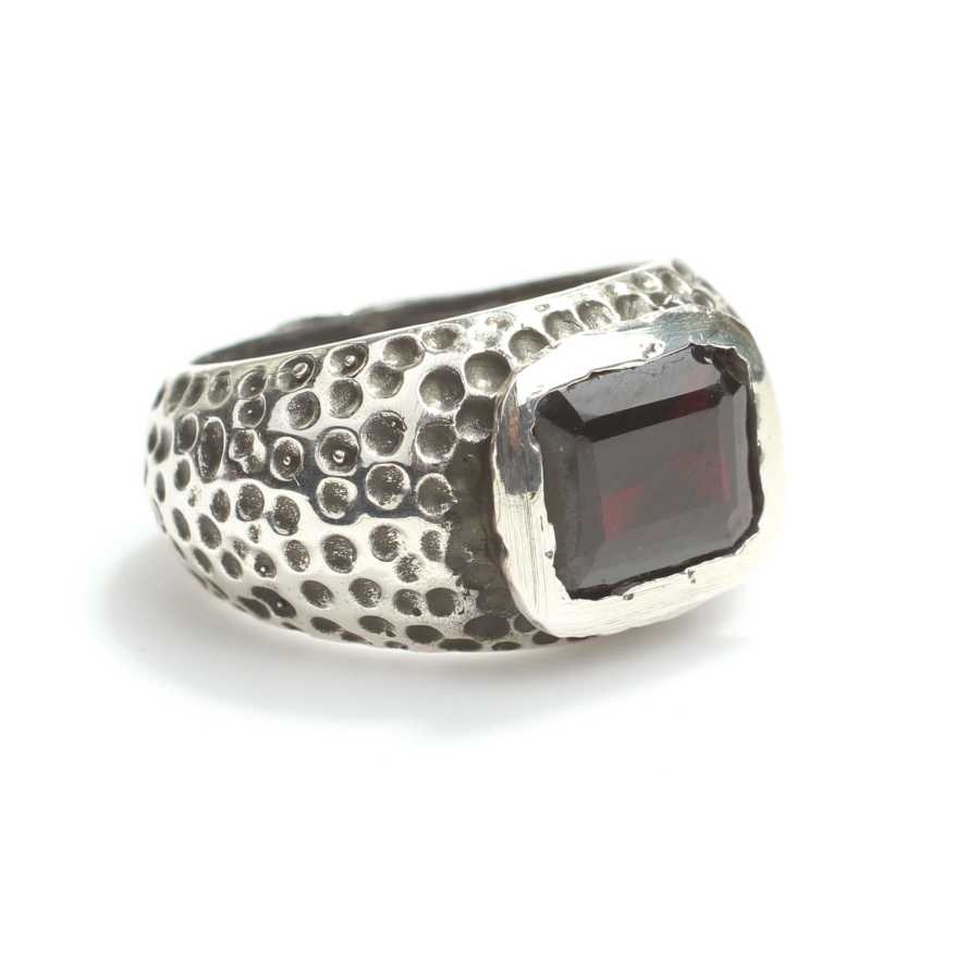 Yüzük 925 ayar gümüşten üretilmiştir. Taşlı yüzük 1,2 cm'ye 1,0 cm boyutlarındadır. Resimdeki yüzük 16 ölçüdür, ancak tüm ölçüler özel olarak yapılabilmektedir. Yüzük garnet taşlıdır. Ağırlığı 9,03 gramdır.