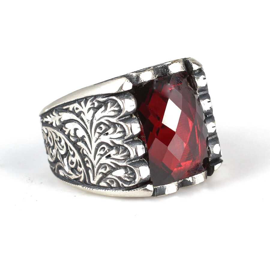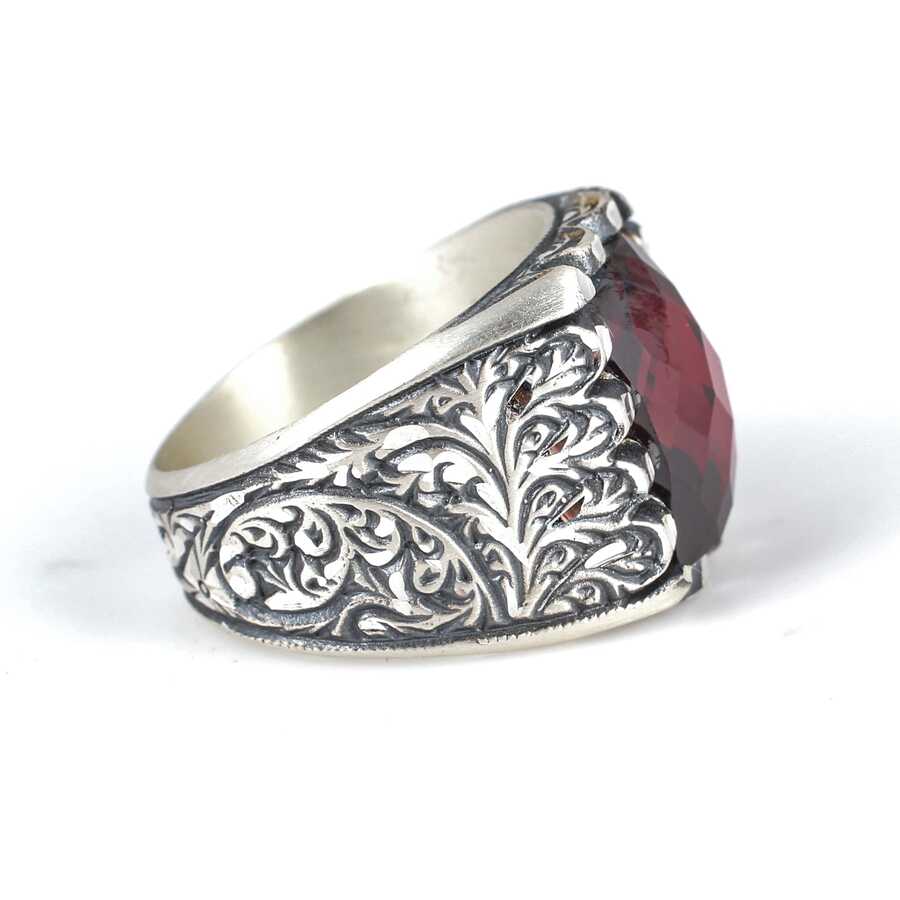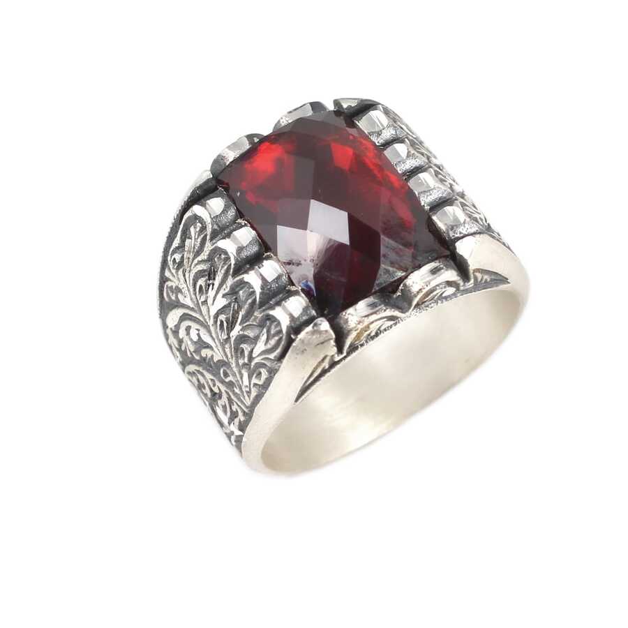 Yüzük 925 ayar gümüşten üretilmiştir. Yüzüğün üzerinde el kalemi atılarak tasarlanmıştır. Taşlı yüzük 1,4 cm'ye 1,0 cm boyutlarındadır. Resimdeki yüzük 22 ölçüdür, ancak tüm ölçüler özel olarak yapılabilmektedir. Yüzük garnet taşlıdır. Ağırlığı 15,72 gramdır.