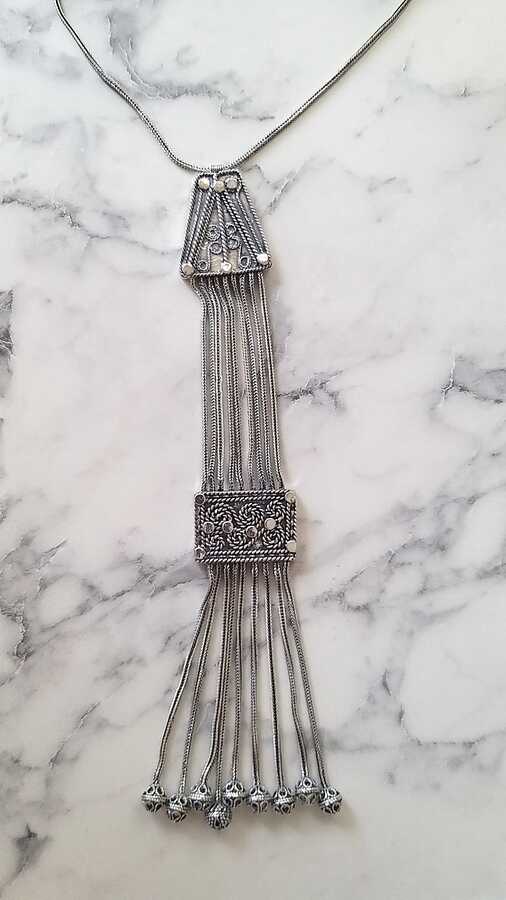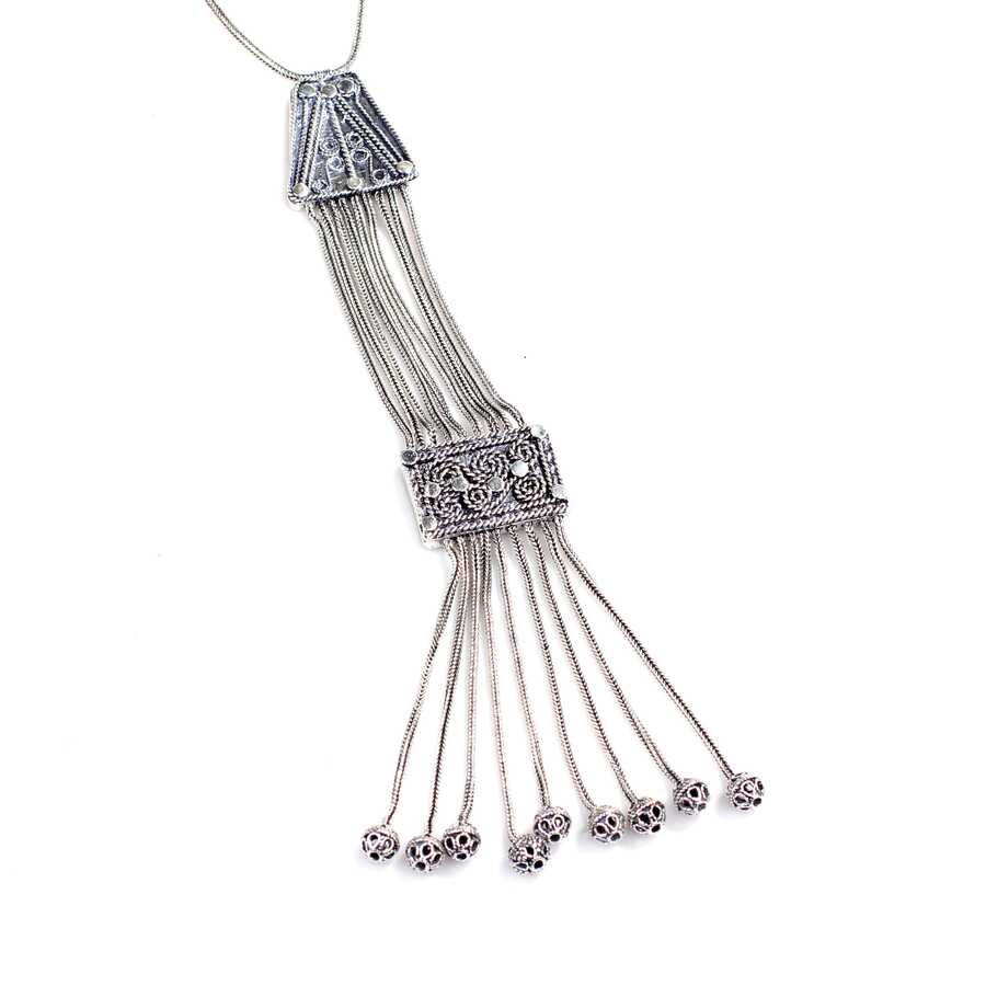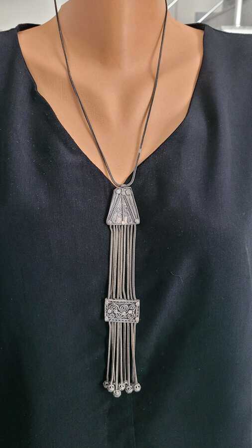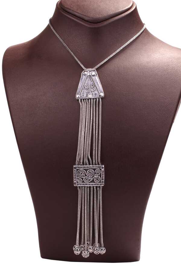 Gümüş kolye 925 ayar gümüşten yapılmıştır. Gümüş kolye tilki kuyruğu zincirli ve 60 cm uzunluğundadır. Kolye ucu 19 cm uzunluğundadır. Dörtgen parçanın boyutu 2,8 cm'ye 3,1 cm , ucundaki toplar 0,7 cm ve Dikdörtgen şeklindeki parça 3 cm'ye 2 cm boyutlarındadır. Kolye taşsızdır. Ağırlığı 45,53 gramdır.