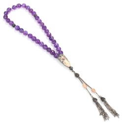 Küre kesim gerçek ametist taşı tesbih 0,8 cm boyutlarındadır. Gümüş püskülü dahil tespih toplam uzunluğu 26 cm'dir. Tesbih ametist ve siyah zirkon taşlıdır. Püskül ve imame siyah rodaj üzeri pembe rodaj kaplamalıdır. Tespihin ağırlığı 36,4 gramdır.