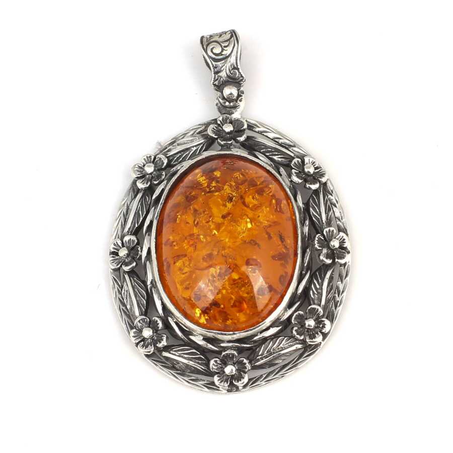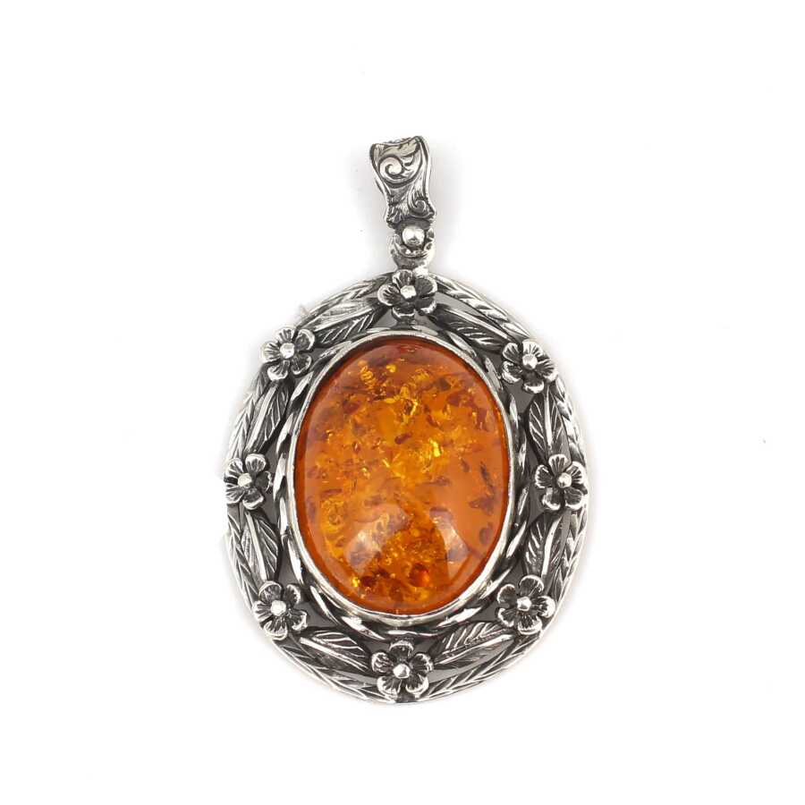 Kolye ucu 925 ayar gümüşten imal edilmiştir. Oval çiçek model çerçeve içindeki gerçek kehribar taş kolye ucu tepelik dahil 60*38 mm boyutlarındadır. Zincir dahil değildir. Kolye ucu gerçek kehribar taşlıdır. Ağırlığı 20,6 gramdır.
