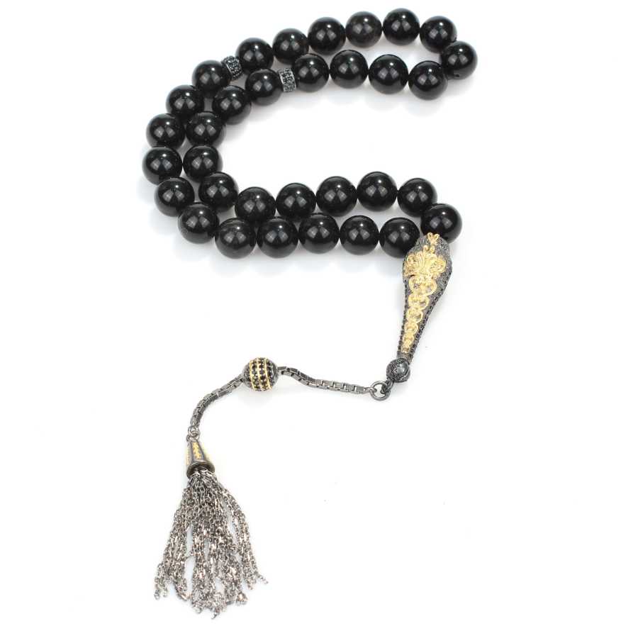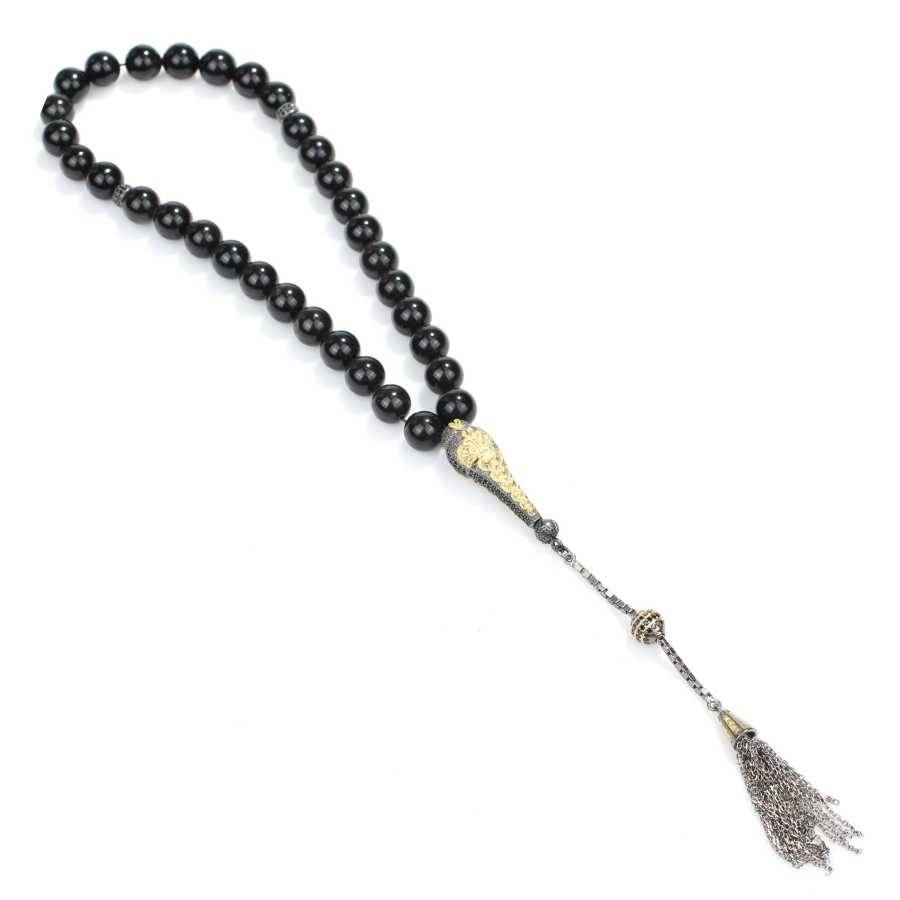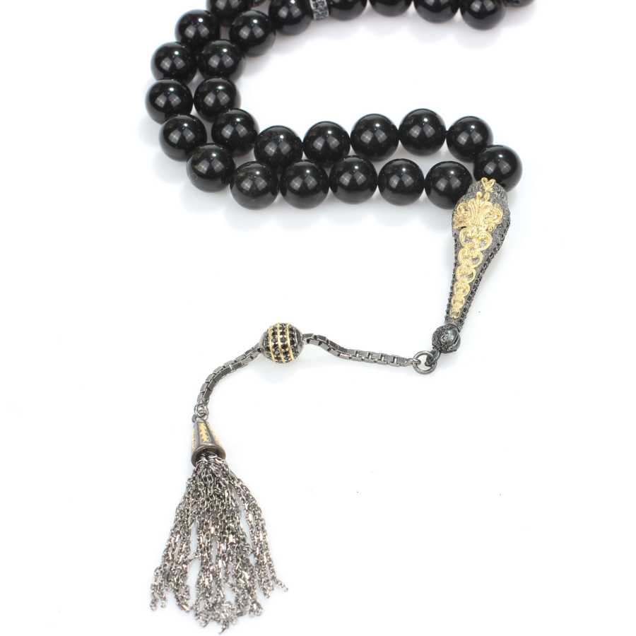 Küre kesim gerçek oniks taşı tesbih 1 cm boyutlarındadır. Gümüş püskülü dahil tespih toplam uzunluğu 30 cm'dir. Tesbih oniks ve siyah zirkon taşlıdır. Püskül ve imame siyah rodaj üzeri pembe rodaj kaplamalıdır. Tespihin ağırlığı 54,1 gramdır.